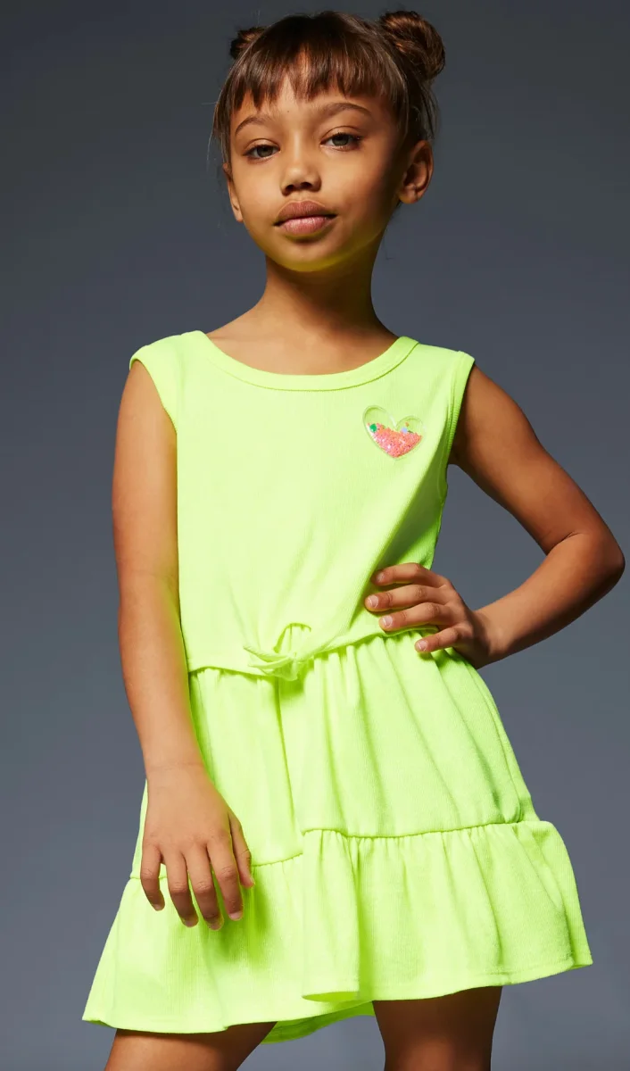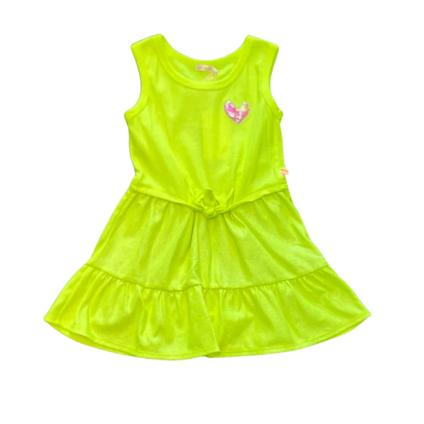 Abito Billieblush a costine di color giallo fluo smanicato con nodo in vita e balza sul fondo con cuore in 3d sul petto lato sinistro