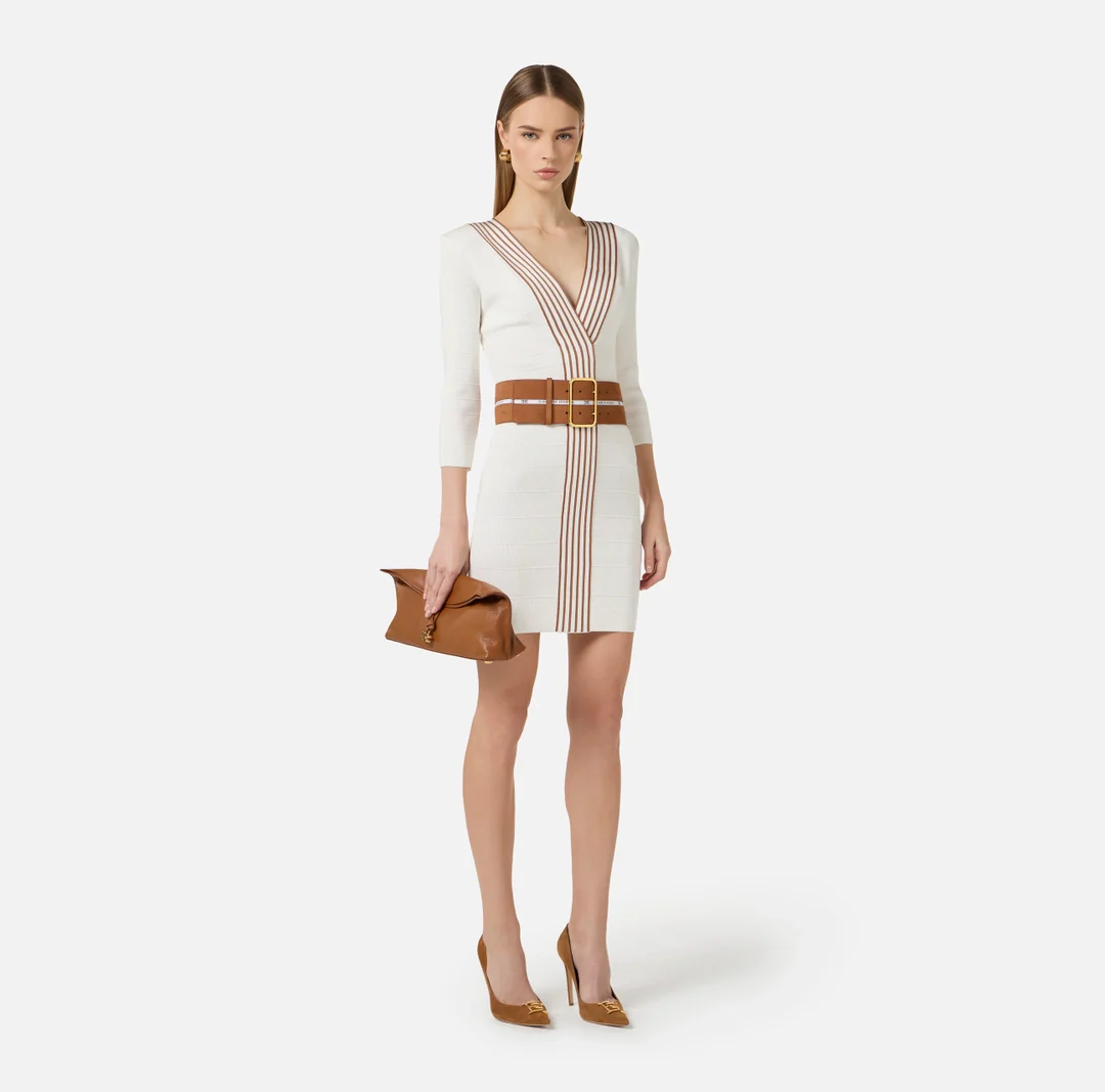 Abito in maglia dalla vestibilitร aderente. Il vestito ha maniche ยพ e spalle strutturate per una silhouette geometrica. Si distingue per le bande decorative che incorniciano il busto con righe a contrasto. La lavorazione a costine e le nervature orizzontali rendono la trama vibrante. Cintura alta in vita.