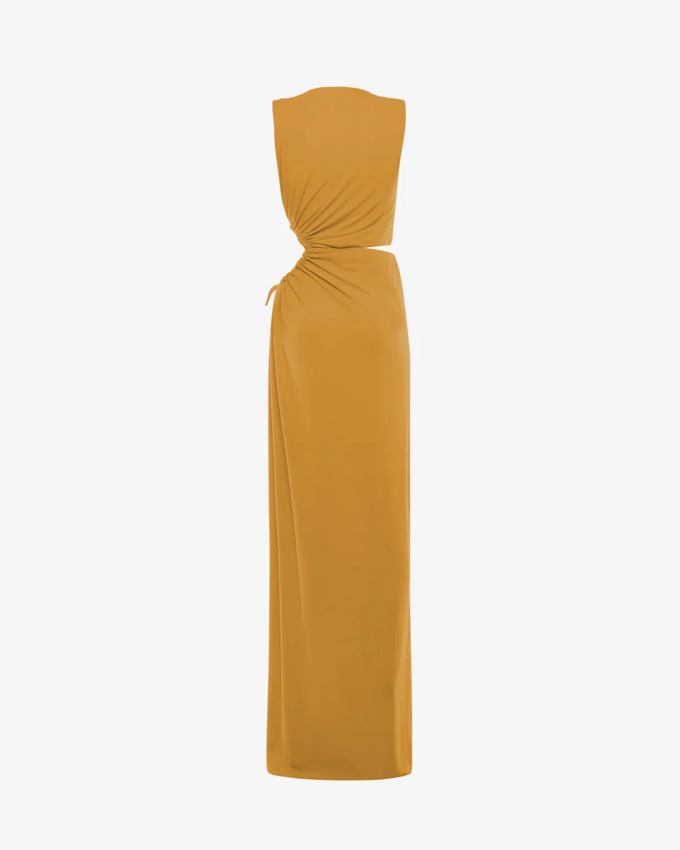 Abito lungo in jersey con dettagli cut-out strategici, perfetto per un look audace e moderno. Il tessuto elasticizzato valorizza la silhouette, mentre i tagli sul corpo aggiungono un tocco sensuale. Ideale per serate, eventi speciali o party dal mood glamour. tessuto: 95%PL 5%EA