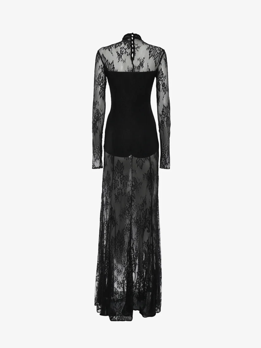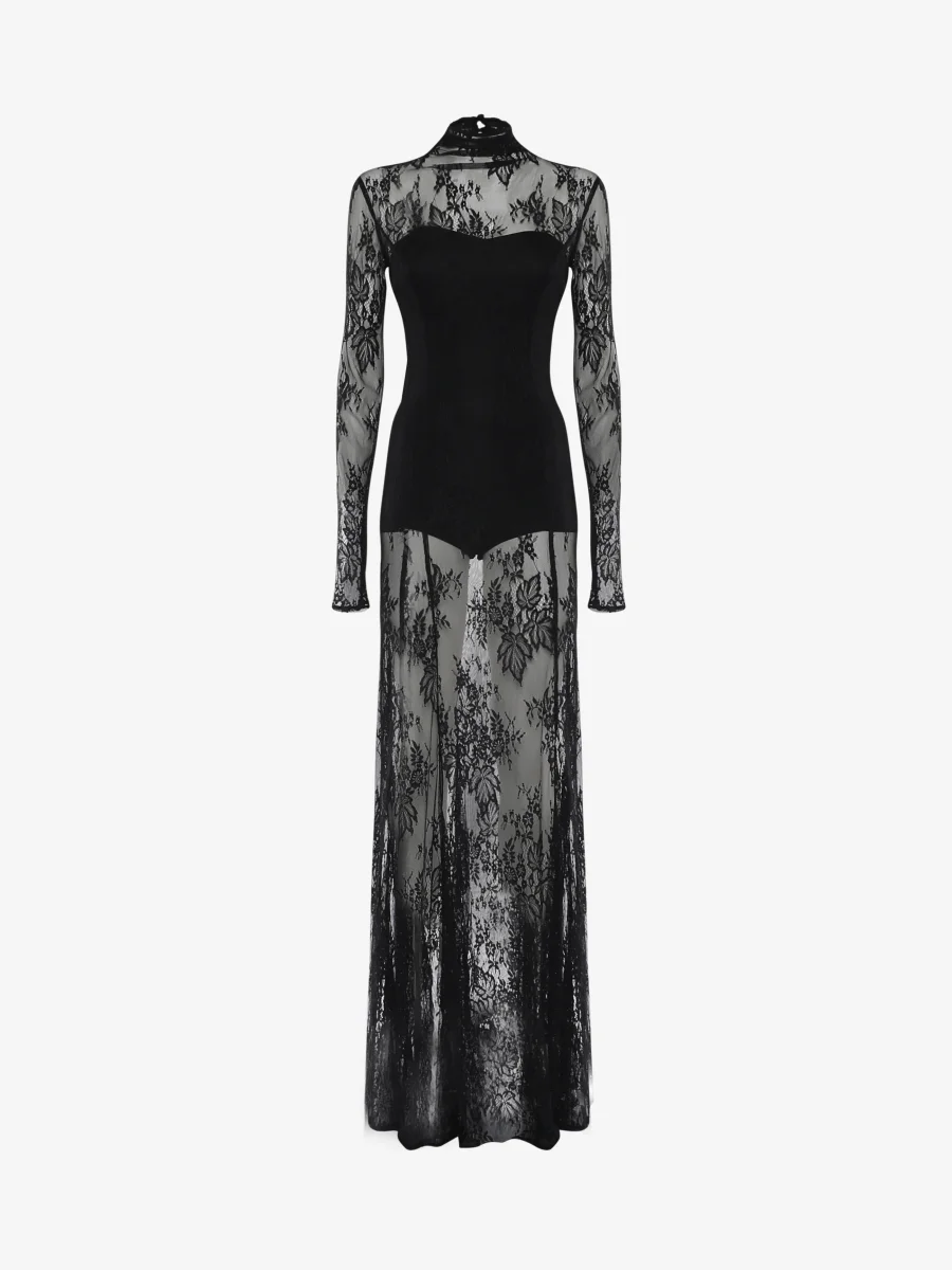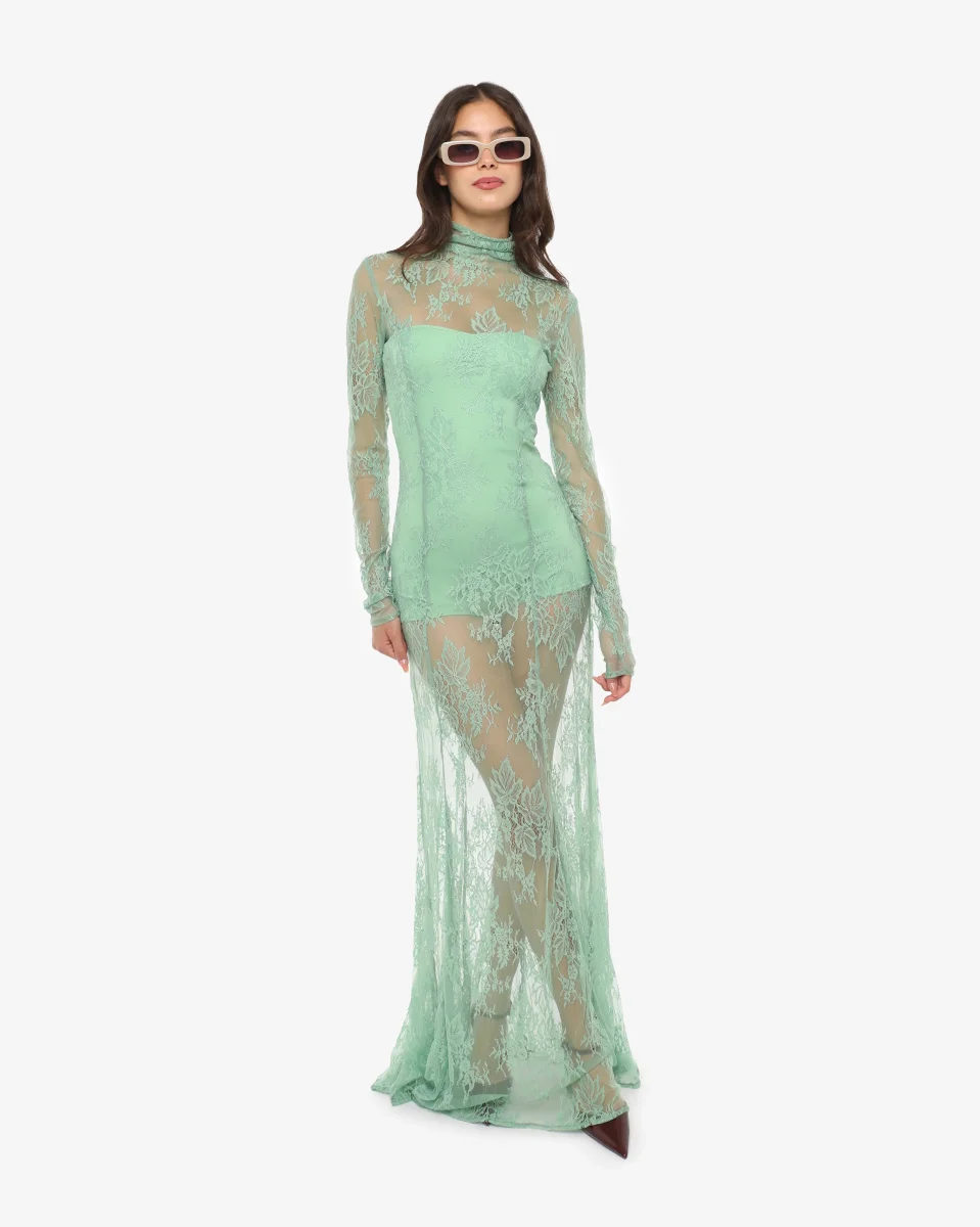 Abito lungo in pizzo con collo alto