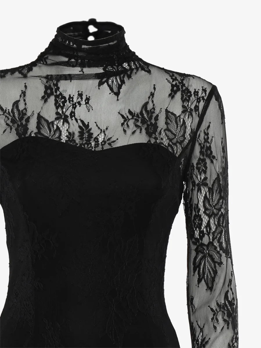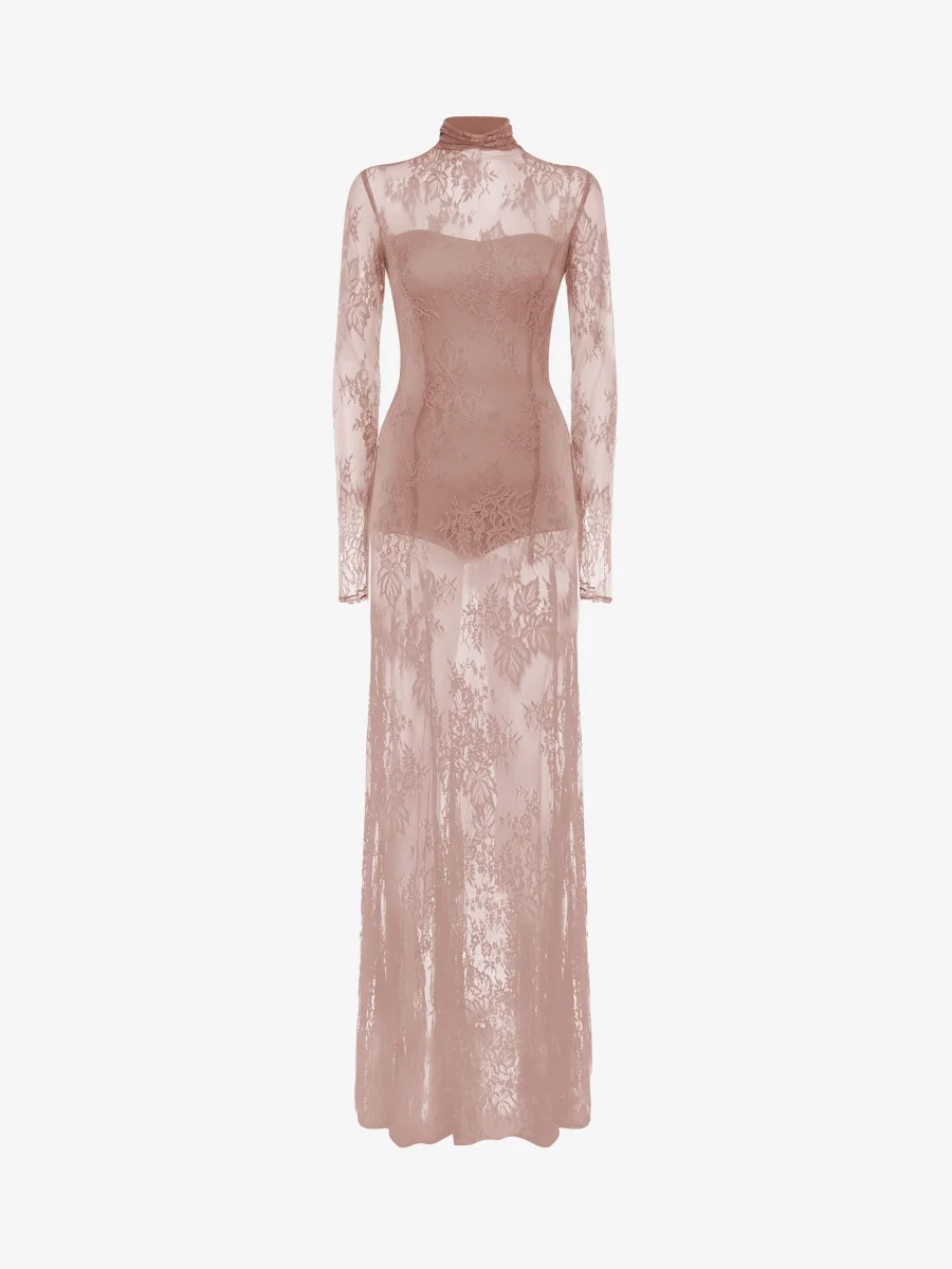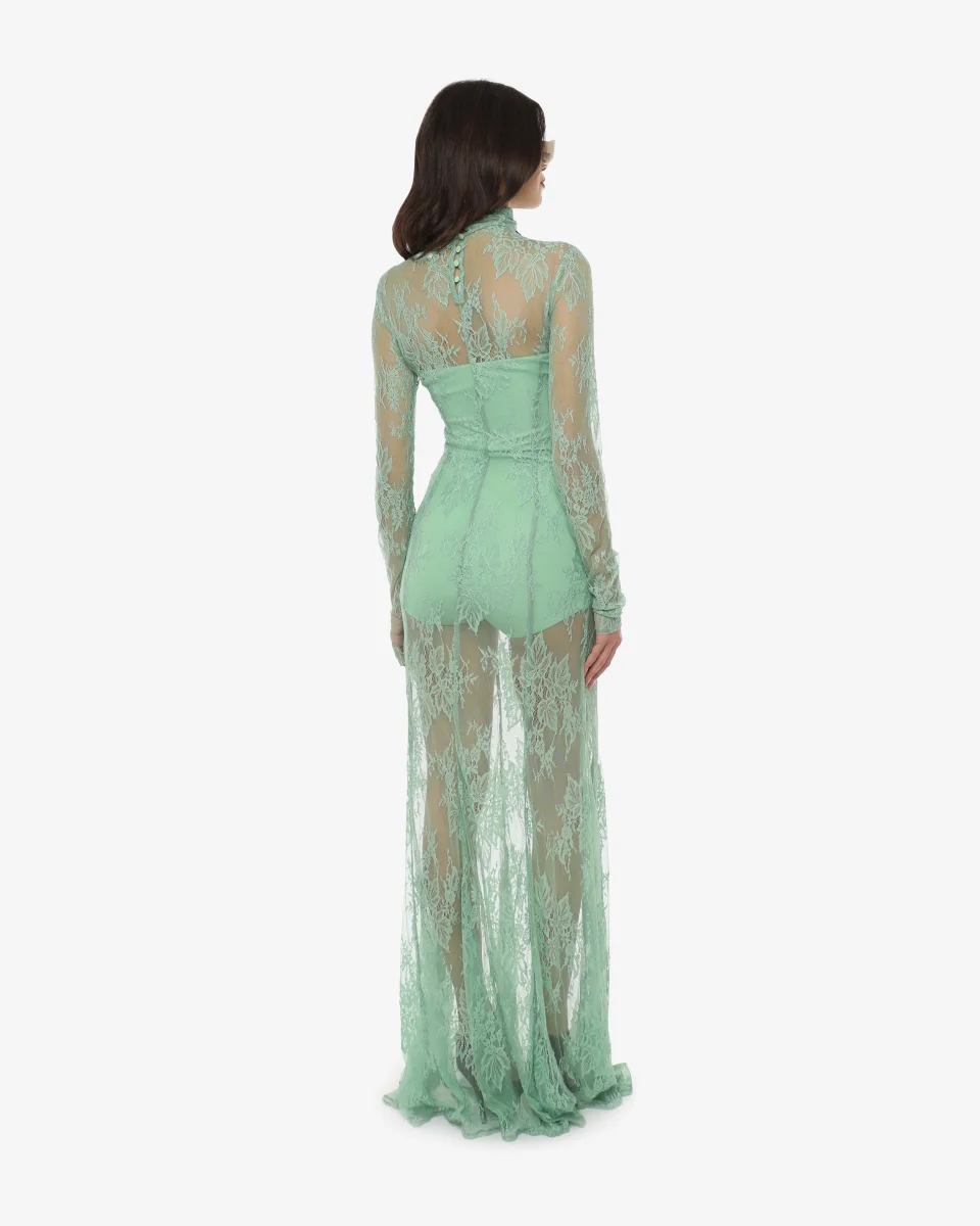 Abito lungo in pizzo con collo alto