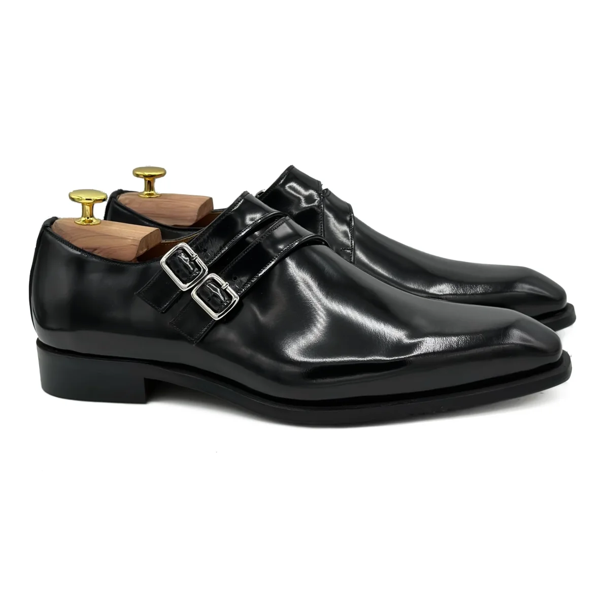 Doppia fibbia in pelle nera, Scarpe dalla linea pulita ed elegante in comoda pelle di vitello spazzolata. Materiale: Pelle di vitello spazzolata Colore: Nero Suola: Cuoio / Cuoio antiscivolo Costruzione: Blake Se vuoi cambiare colore, materiale o tipo di suola, compila il form sottostante: realizzeremo la scarpa che desideri. PERSONALIZZA ORA