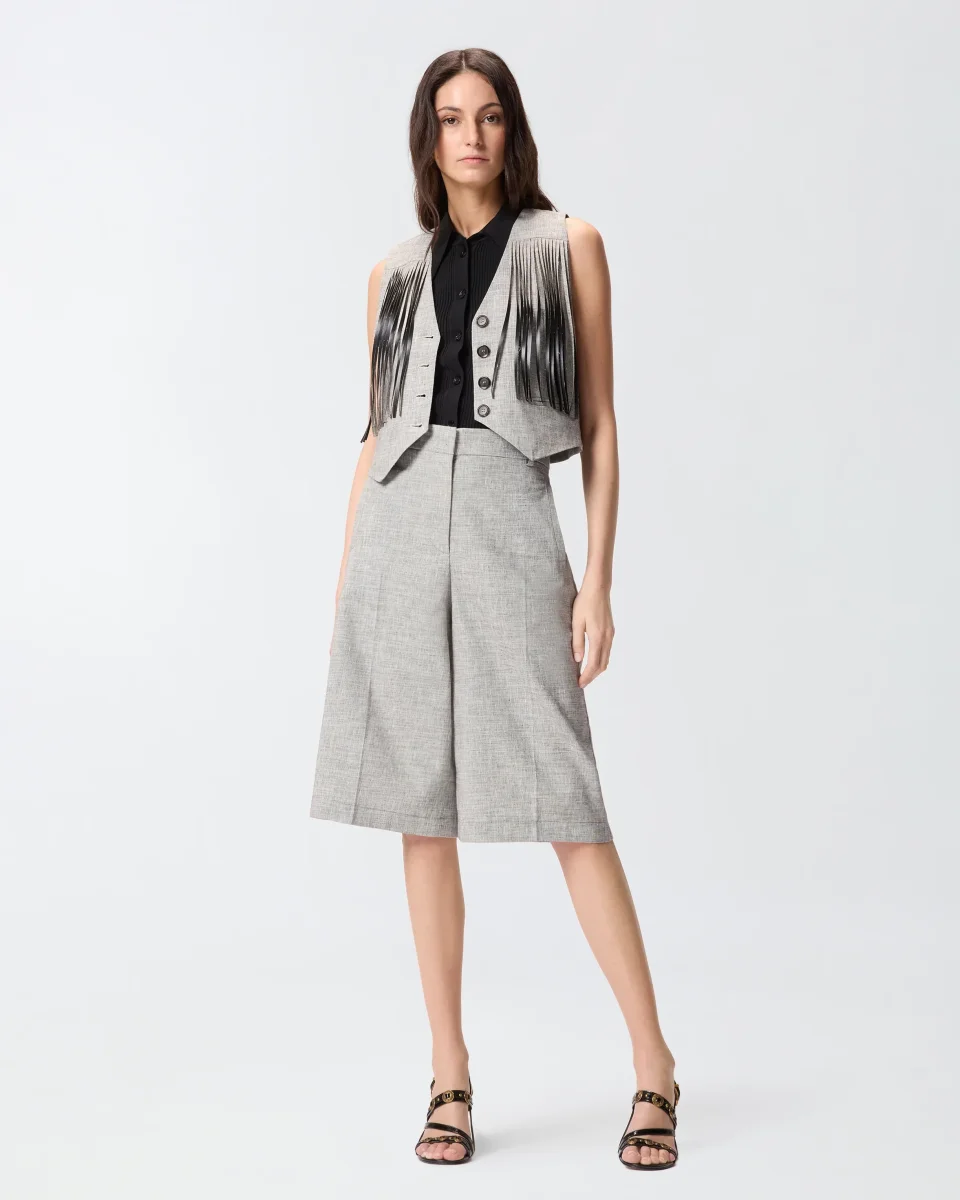 Bermuda realizzati in misto cotone e lino fiammato fil-à-fil tinto in filo, un tessuto dalla texture leggermente irregolare e screziata che crea un raffinato effetto ottico bicolore. Il capo presenta un design a gamba dritta con piega stirata centrale, una tasca a filetto sul retro, passanti per cintura e un’elegante chiusura frontale nascosta. Essenziale e […]