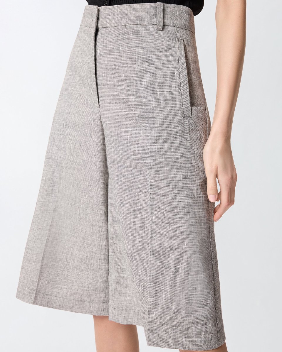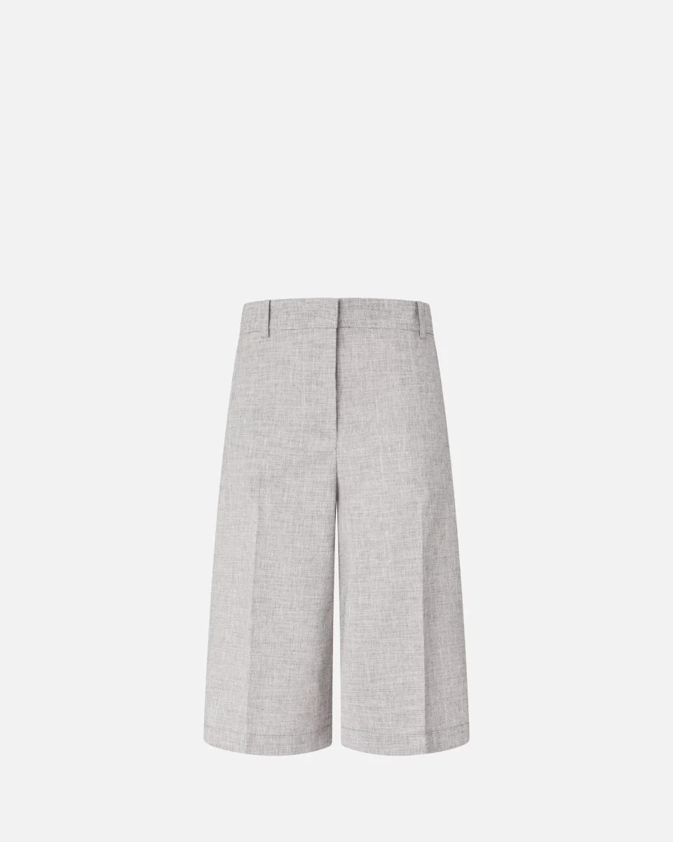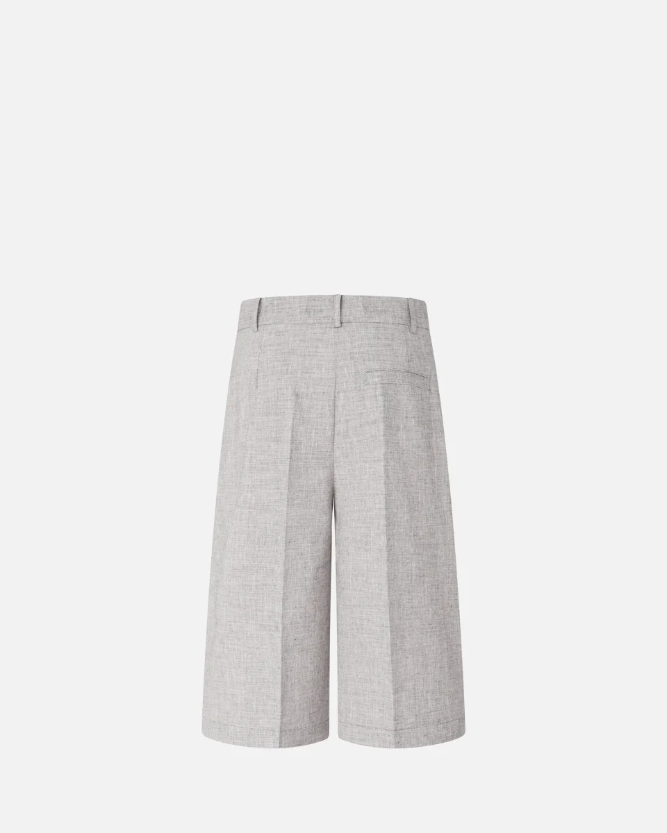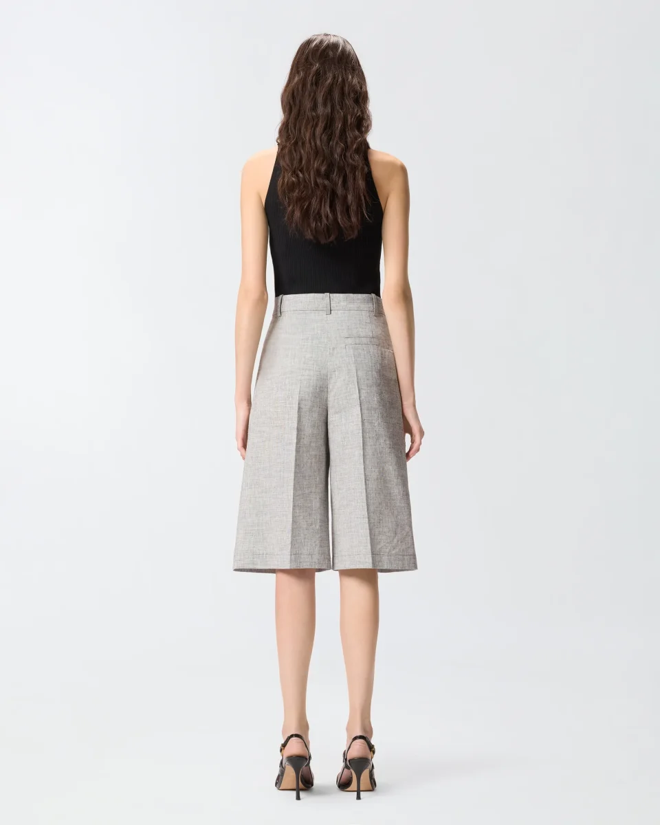 Bermuda realizzati in misto cotone e lino fiammato fil-à-fil tinto in filo, un tessuto dalla texture leggermente irregolare e screziata che crea un raffinato effetto ottico bicolore. Il capo presenta un design a gamba dritta con piega stirata centrale, una tasca a filetto sul retro, passanti per cintura e un’elegante chiusura frontale nascosta. Essenziale e contemporaneo, questo modello diventerà un vero e proprio passe-partout del tuo guardaroba.
