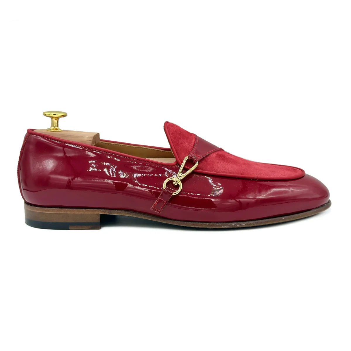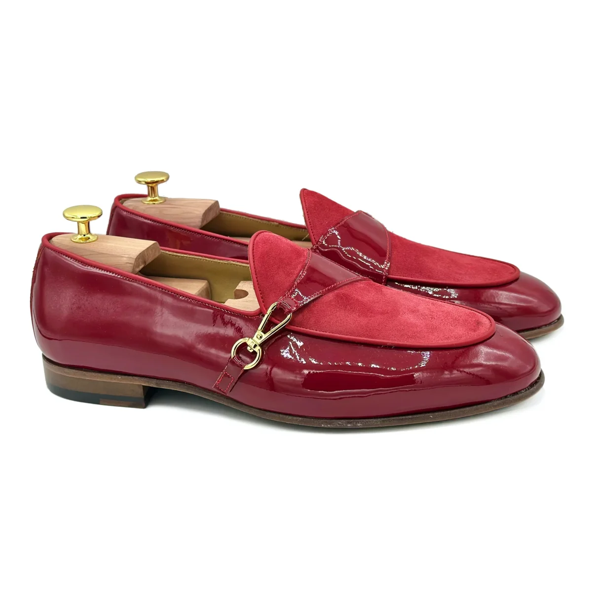 Mocassini con morsetto in pelle rossa. Eleganti calzature in vernice rossa e mascherina in velluto per un look ricercato ed esclusivo.