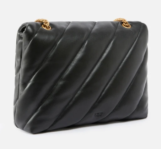 Big Love Bag Puff in morbida nappa con maxi trapuntatura obliqua. La chiusura è completata dall’iconica fibbia in metallo Love Birds Diamond Cut. L’interno è foderato in microfibra scamosciata e comprende tramezza chiusa con zip e tasca a parete. La tracolla combina la classica catena metallica rotonda al pratico spallaccio in nappa. – BIG LOVE BAG PUFF MAXI QUILT