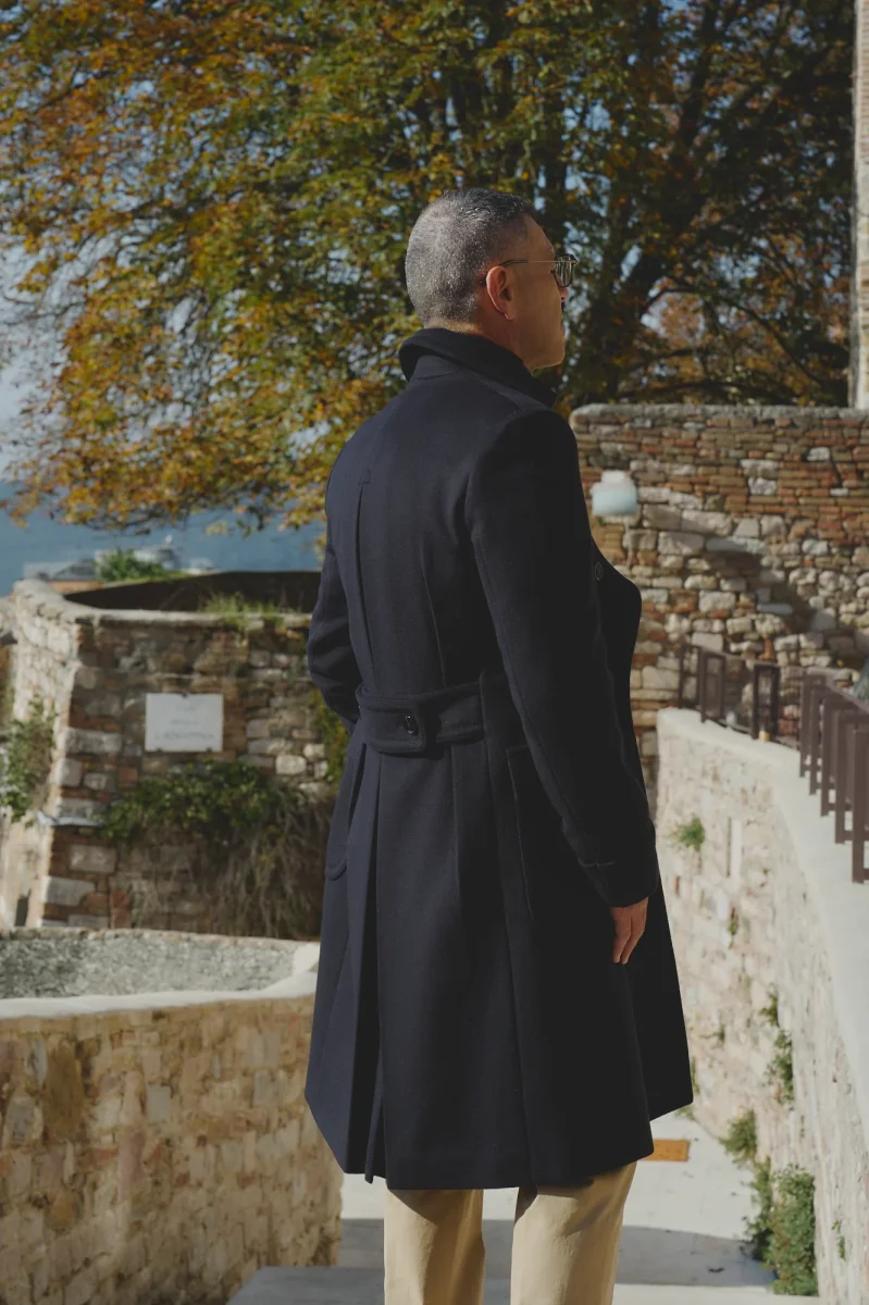 Cappotto doppiopetto. Chiusura a 6 bottoni. Tasche a toppa con le pattine. Spacco centrale con i bottoni. Polsino con martingala. Martingala dietro con bottoni.