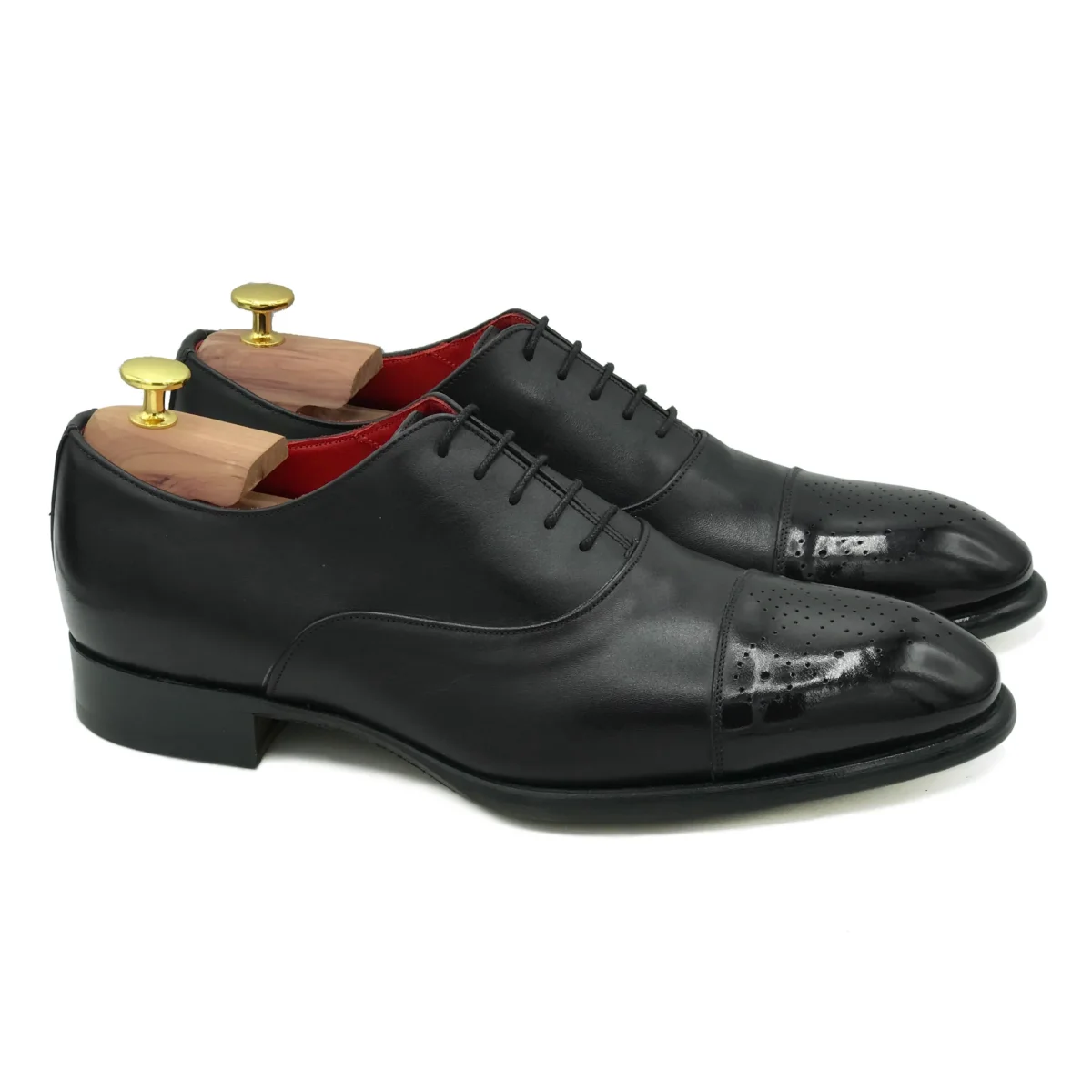 Francesine in pelle nera con decoro semi brogue. Modello oxford stringato con bucature brogues eleganti e raffinate. Scarpe classiche perfette per le occasioni formali, per le cerimonie o per andare in ufficio. La punta lucidata a mano conferisce ulteriore eleganza al tuo look.