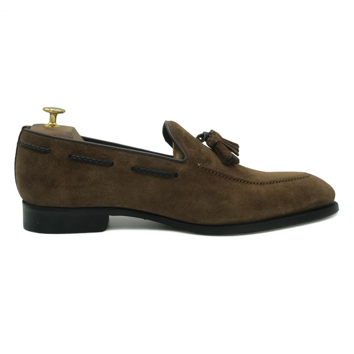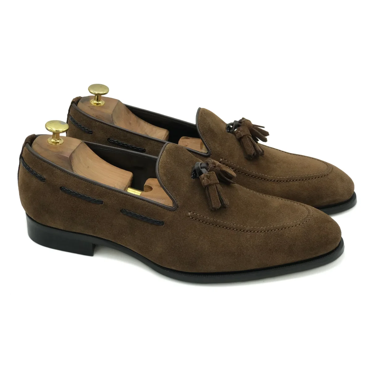 Mocassini con nappine in pelle scamosciata marrone. Scarpe eleganti e raffinate, finemente rifinite a mano. Completano il tuo look in ogni occasione.