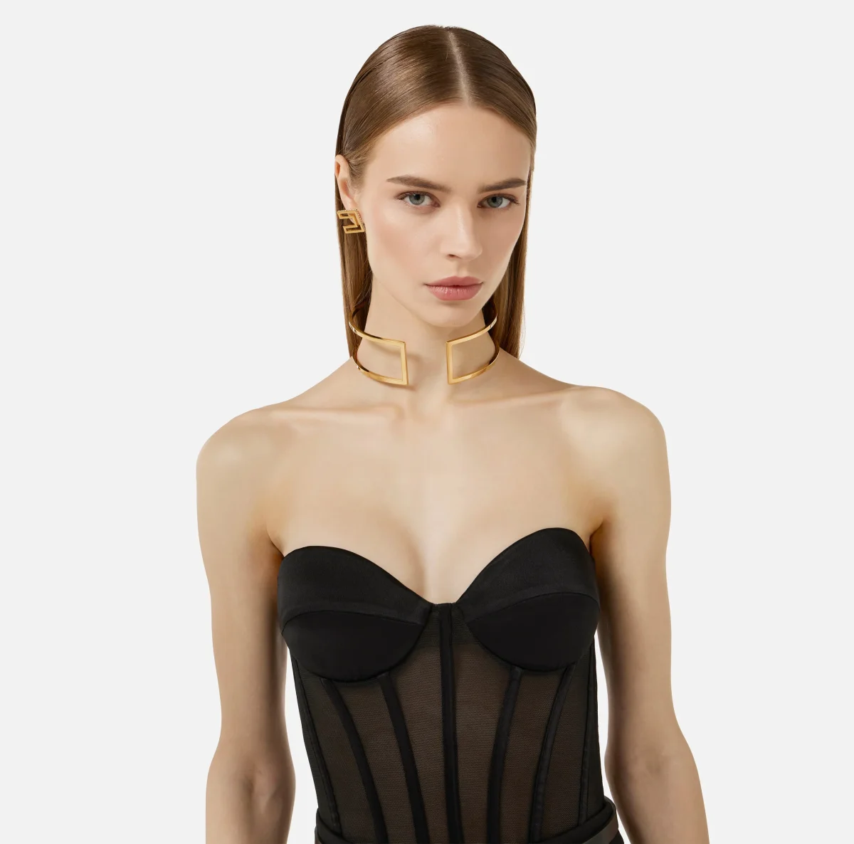 Collana realizzata in metallo con finitura dorata. Con design circolare che ricrea la forma di un logo, abbraccia il collo con linee essenziali.