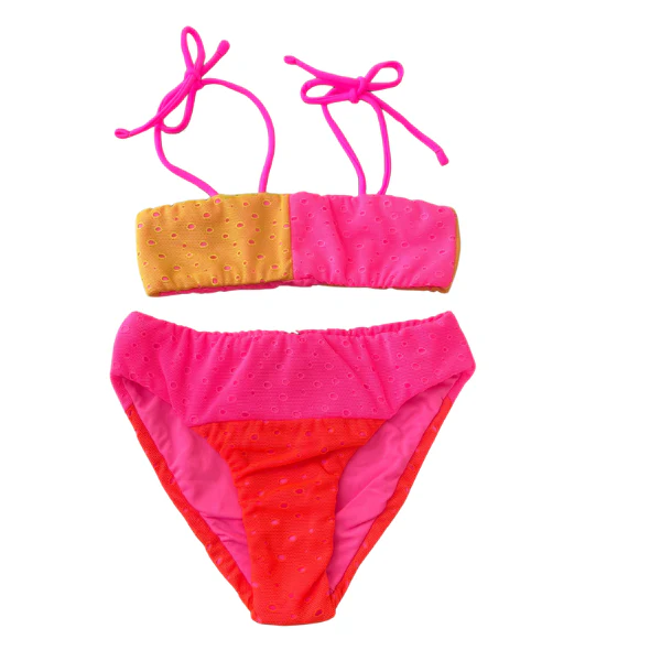 Costume 2 pezzi F**k multicolor con retina con buchini parte sopra a fascia con lacci per allacciare sopra le spalle e mutanda