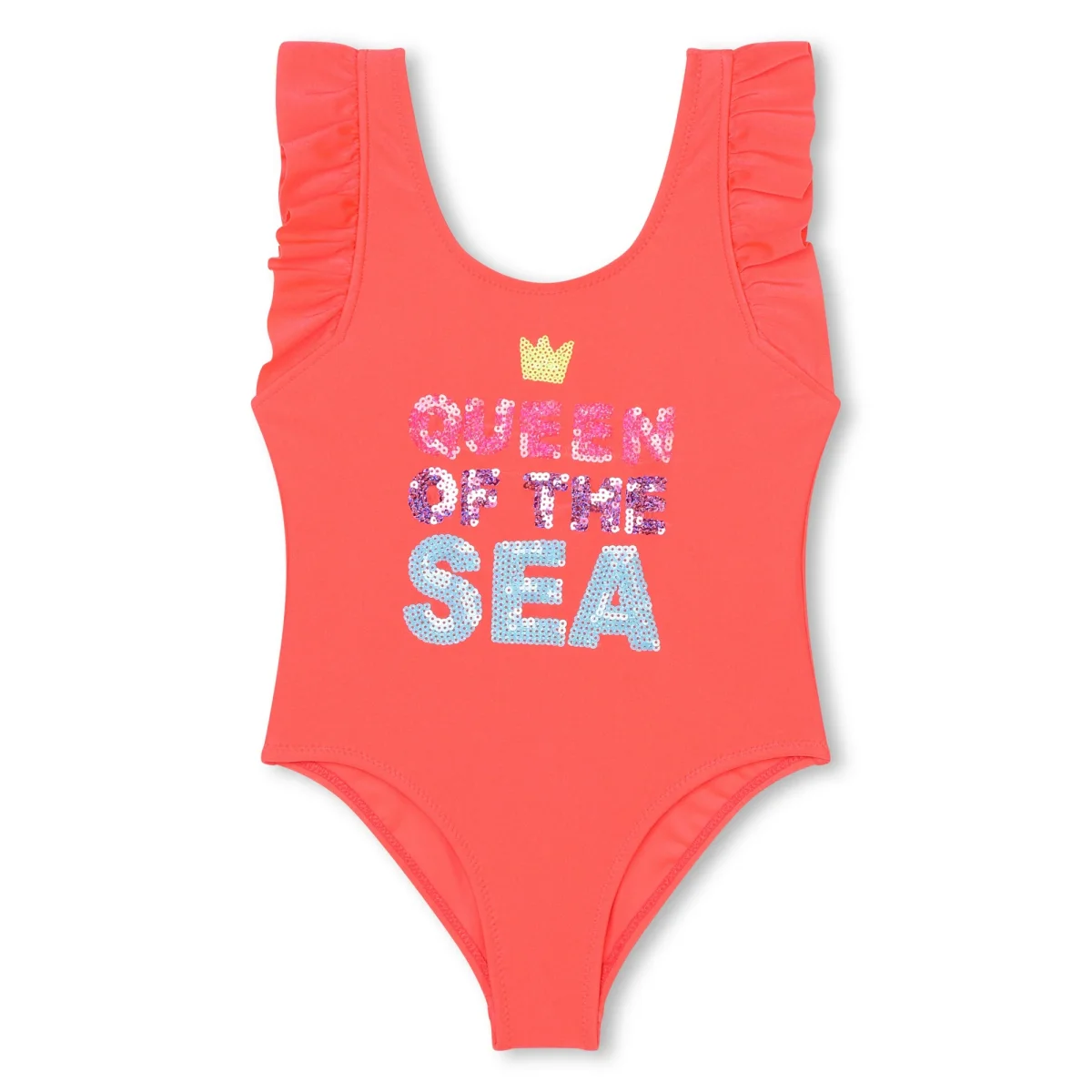 Costume intero Billieblush di color arancio fluo con scritta “Queen of the Sea” con paillettes colorate sul davanti e rouches sulle spalline Composizione: 80% poliammide 20% elastane