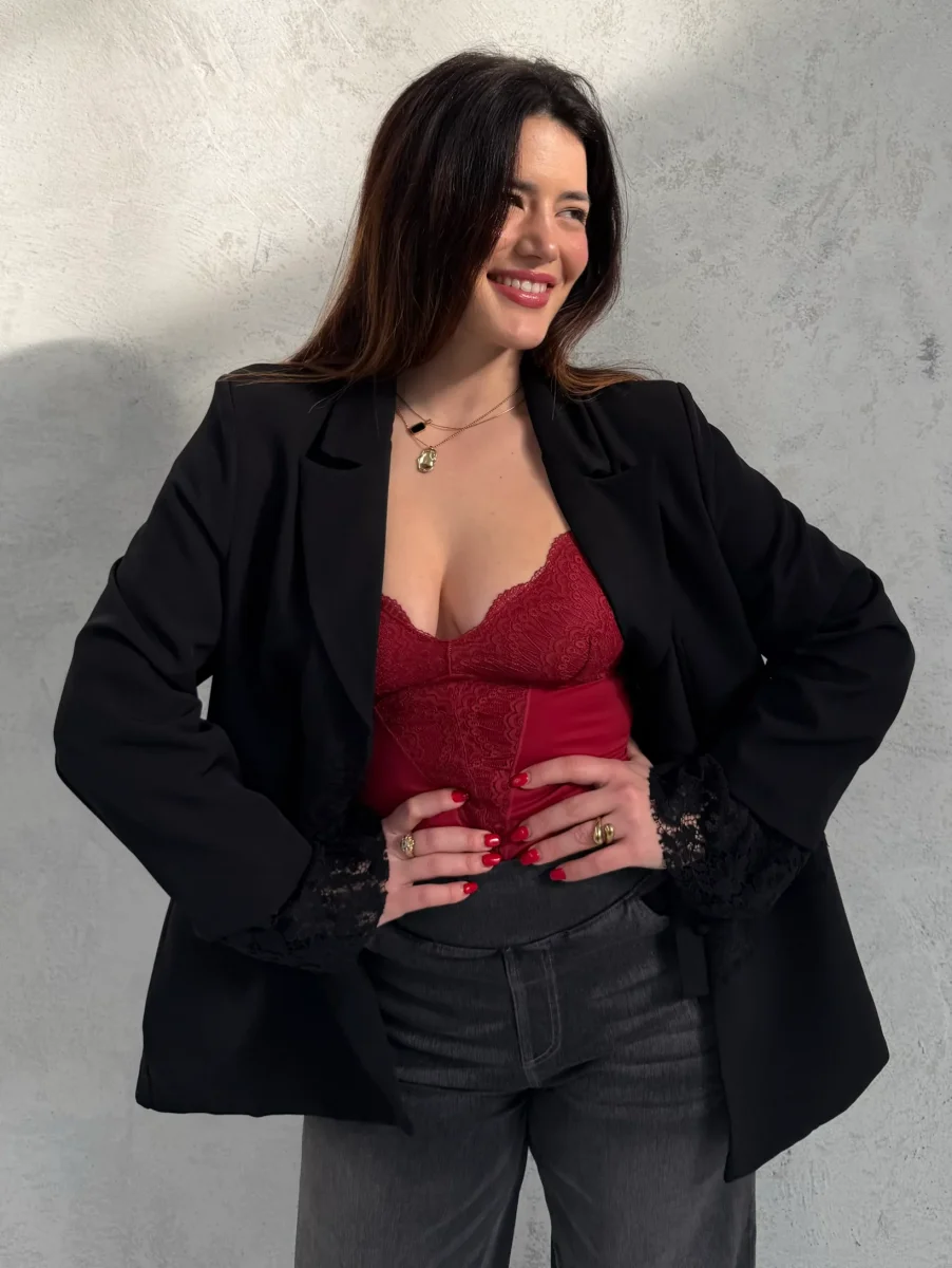 Body realizzato in pizzo rosso, progettato per unire design raffinato e struttura funzionale. Il pizzo delicato, abbinato a una tonalità intensa, dona al capo un’estetica curata ed essenziale, mantenendo una vestibilità confortevole e ordinata.