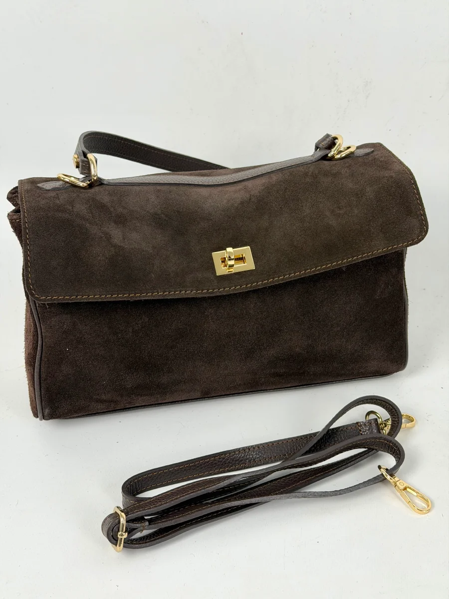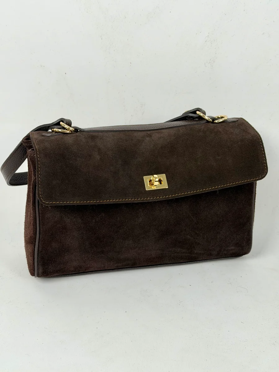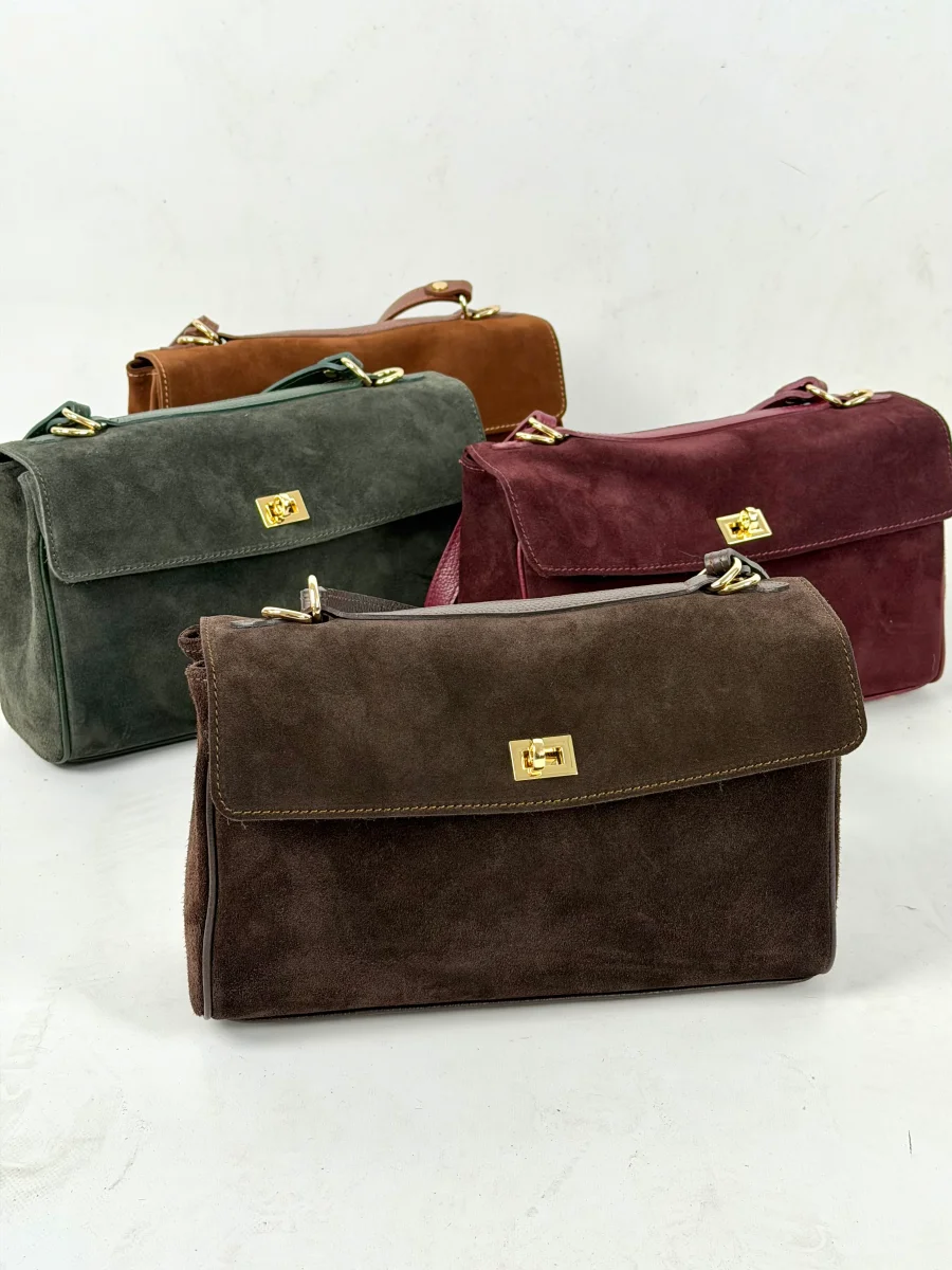 Borsa da donna in vera pelle, scamosciata made in italy di produzione artigianale.. Chiusura a fermaglio , tre scompartimento MISURE: larghezza 31 cm , altezza 19 cm, profonditร 11 cm Dotata di sacca dustbag antipolvere.