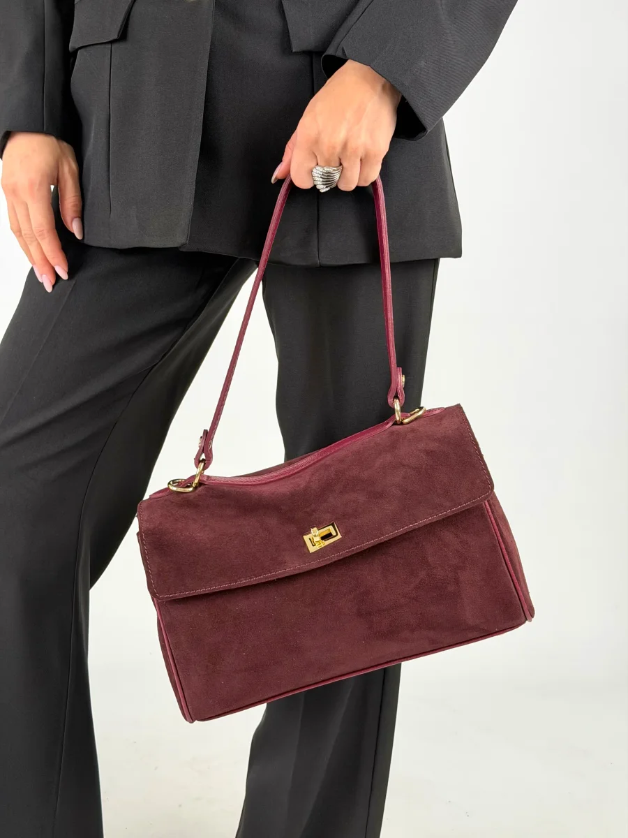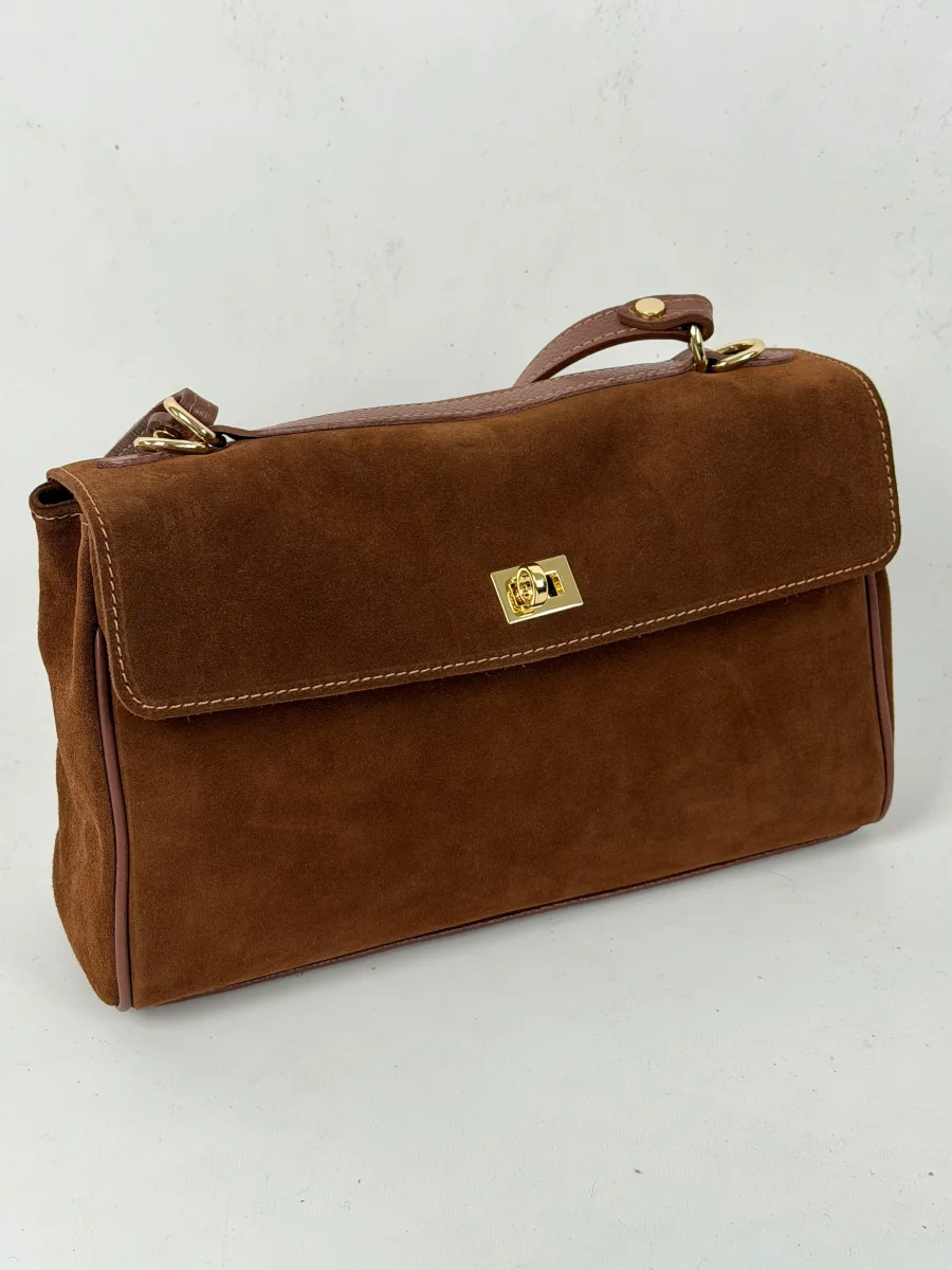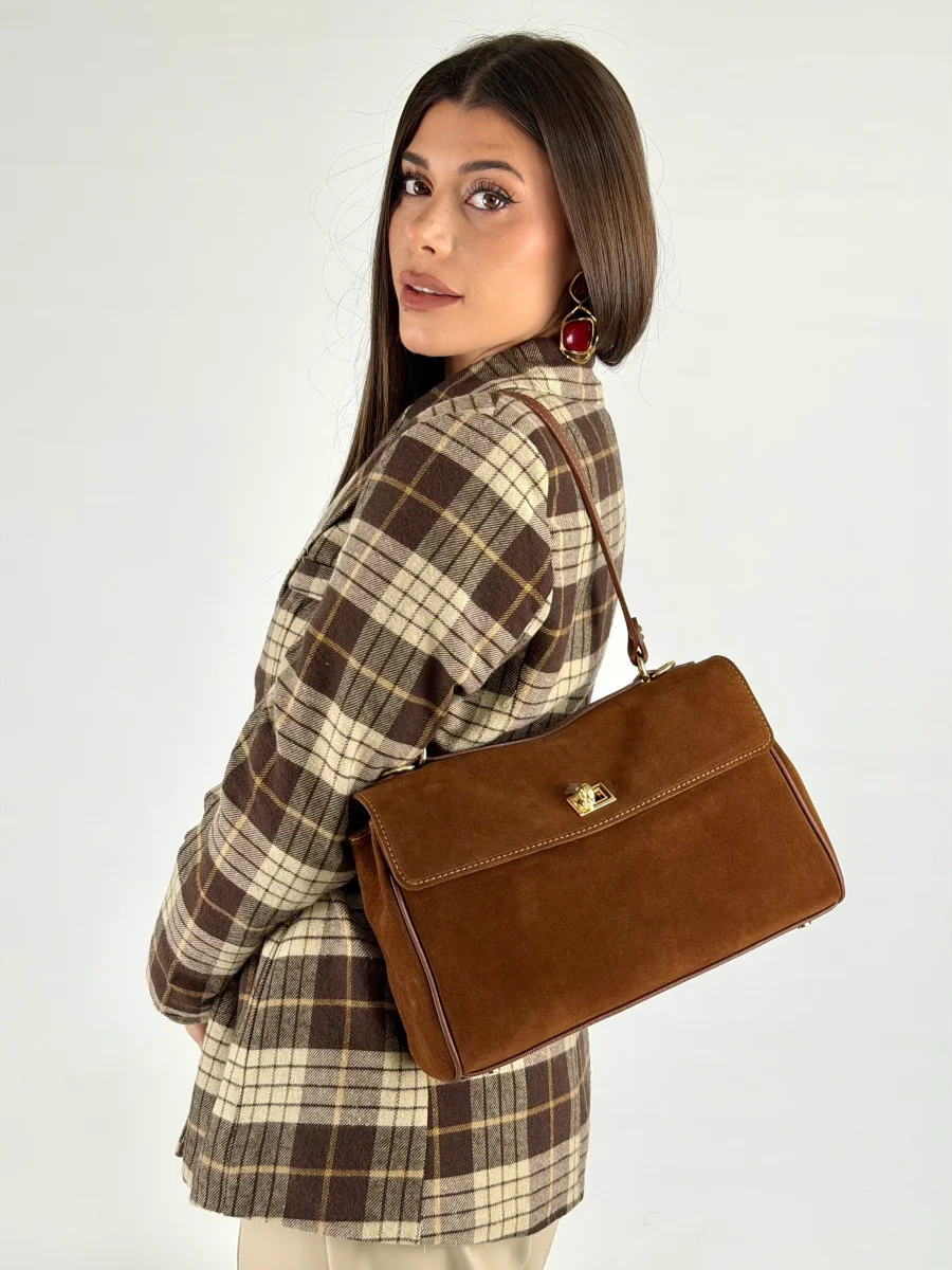 Borsa da donna in vera pelle, scamosciata made in italy di produzione artigianale.. Chiusura a fermaglio , tre scompartimento MISURE: larghezza 31 cm , altezza 19 cm, profonditร 11 cm Dotata di sacca dustbag antipolvere.