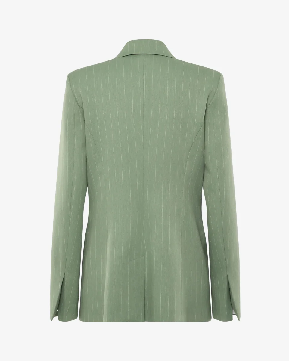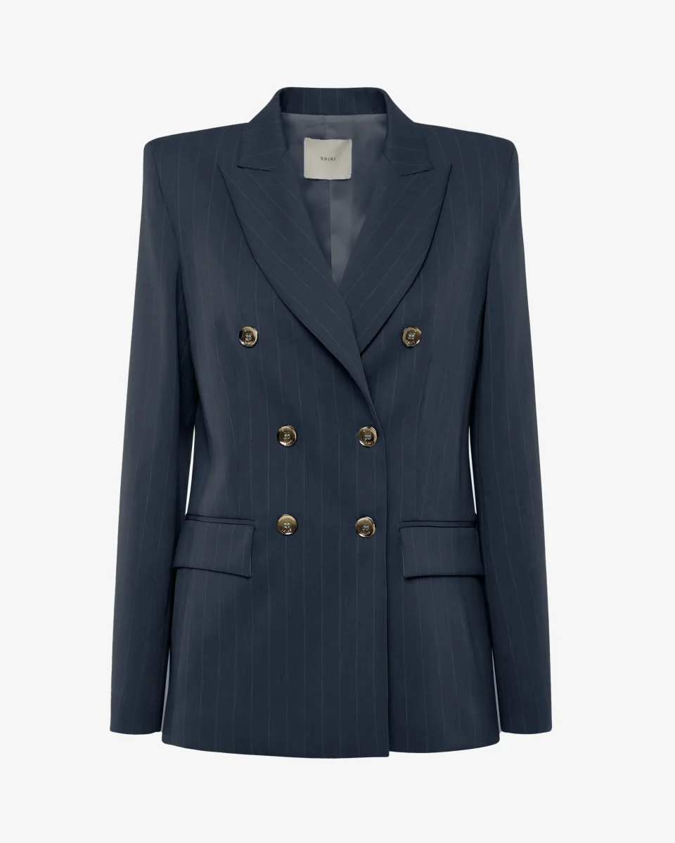 Giacca doppiopetto gessata con bottoni dorati, dal design elegante e deciso. Il taglio sartoriale e le righe verticali slanciano la figura, mentre i bottoni oro aggiungono un tocco sofisticato. Perfetta per look formali, da ufficio o per occasioni speciali con stile.