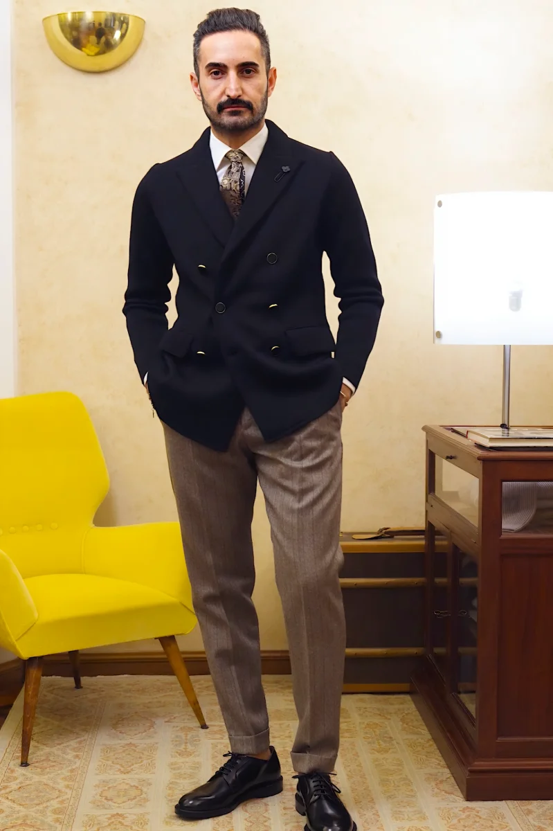 Blazer doppiopetto in maglia punto Milano. Revers a lancia. Bottoni in metallo. Tasche con le pattine. Senza spacchi.