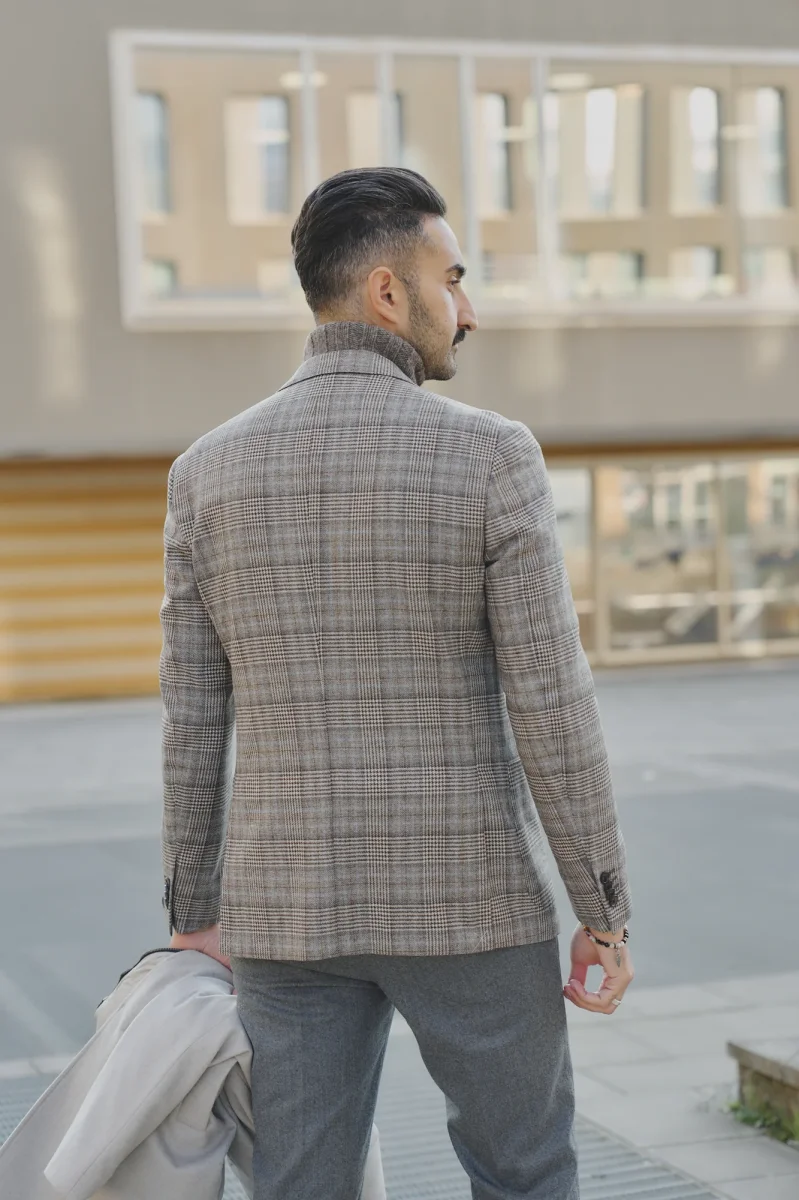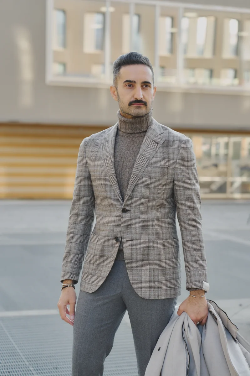 Giacca monopetto fantasia principe di Galles. Chiusura due bottoni. Revers a specchio. Due bottoni. Spacchi laterali. Tasche a toppa. Parzialmente foderata.