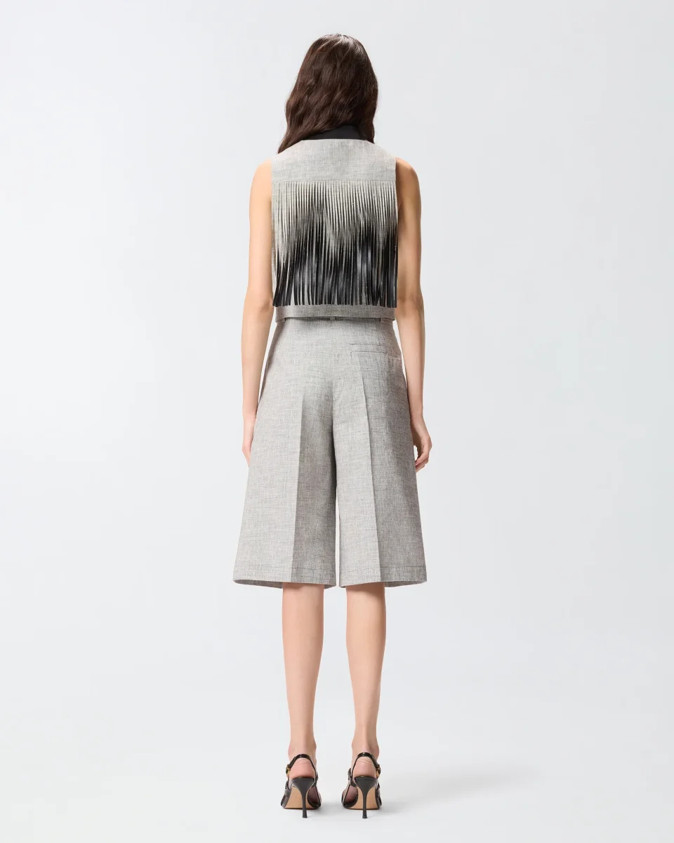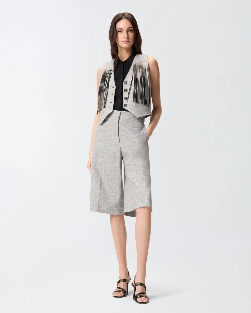 Gilet con abbottonatura frontale realizzato in leggero misto cotone e lino fiammato fil-ร -fil tinto in filo. Il modello, dotato di raffinate tasche a filetto sul davanti, presenta uno scollo a V che fa da contrasto al fondo a punta. La texture irregolare e screziata del tessuto crea un effetto ottico bicolore, mentre le lunghe frange fronte e retro conferiscono al capo un carattere contemporaneo d’ispirazione texana.