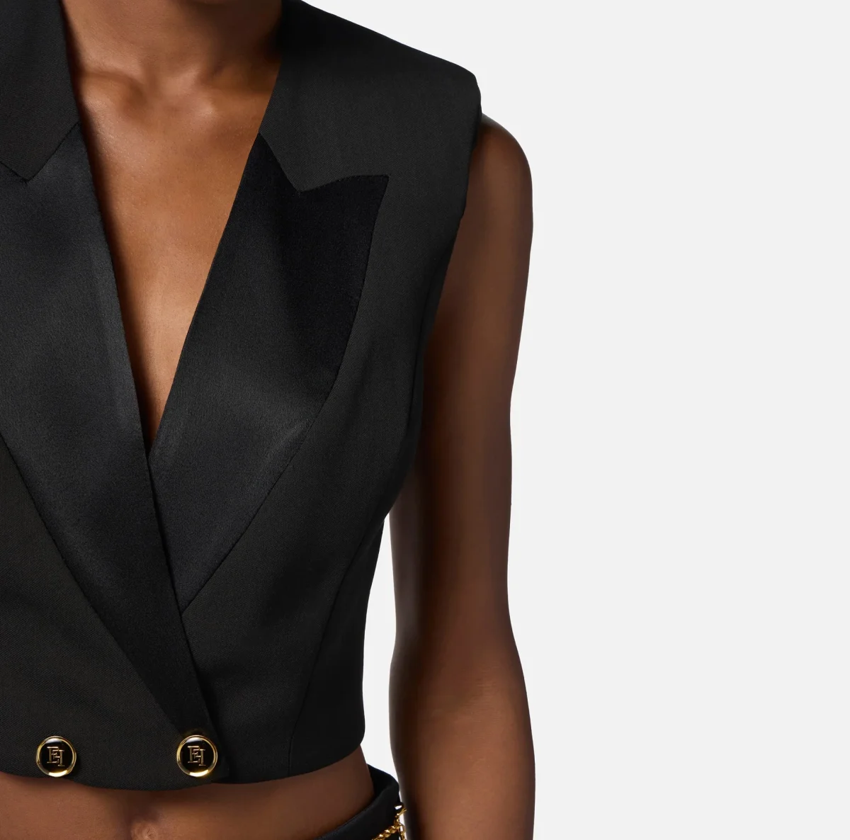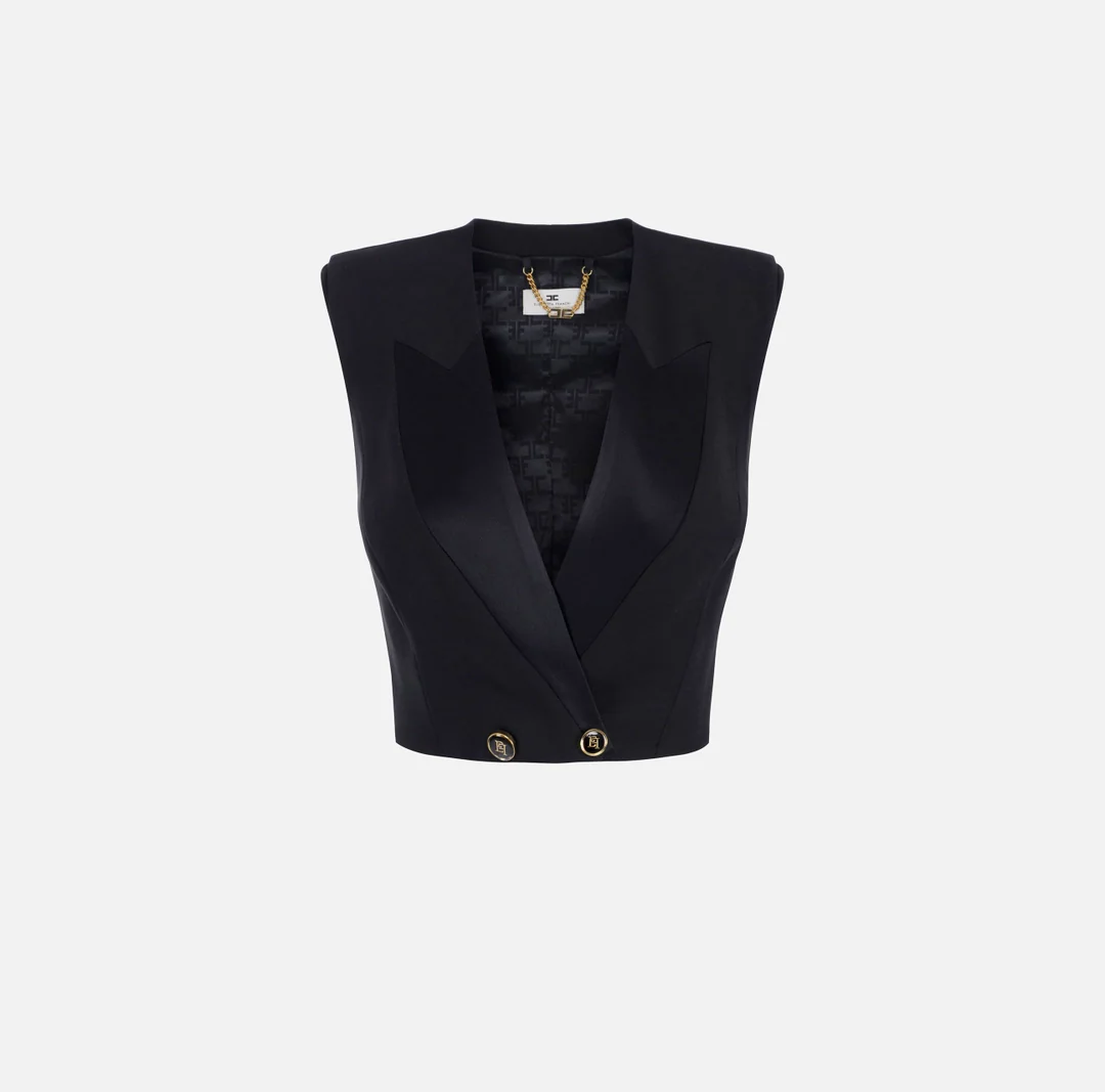 Gilet in crรชpe dalla vestibilitร aderente. Con spalle strutturate, si distingue per il rever intarsiato in raso che crea interessanti contrasti di texture. I bottoni smaltati con logo completano il capo