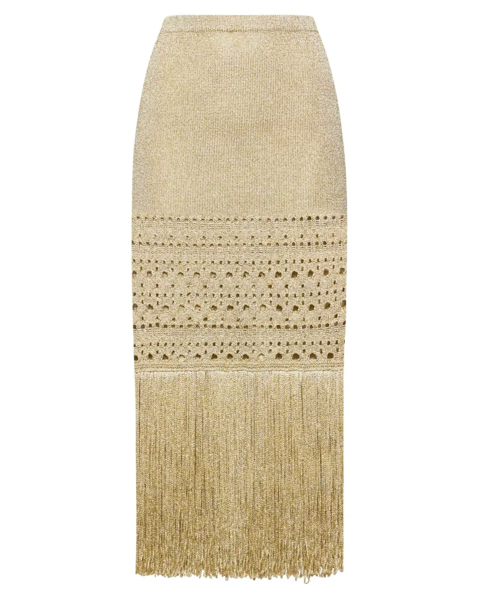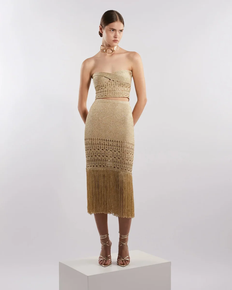 Scopri la gonna a tubino realizzata in filato lurex con frange sul fondo, un capo esclusivo della collezione di Simona Corsellini. Questo modello combina eleganza e movimento grazie alle frange scintillanti che aggiungono un tocco di glamour al design classico della gonna a tubino.
