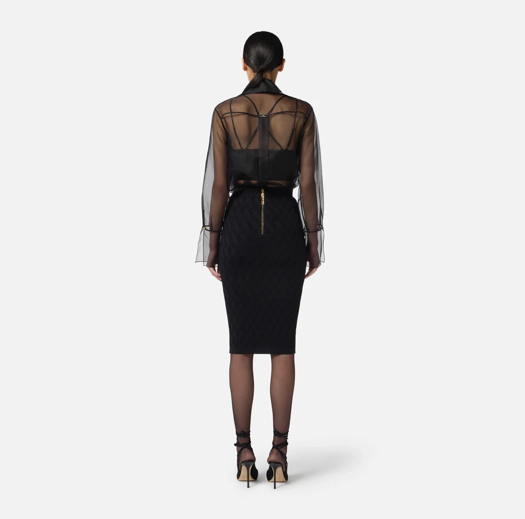 Gonna a tubo in maglia dalla vestibilitร aderente. Con vita alta, si distingue per l’elaborata lavorazione 3D che crea un disegno geometrico a rombi su tutta la lunghezza. Impreziosita dalla catena diamantata con logo e strass che decora il punto vita.