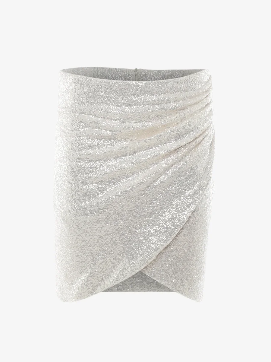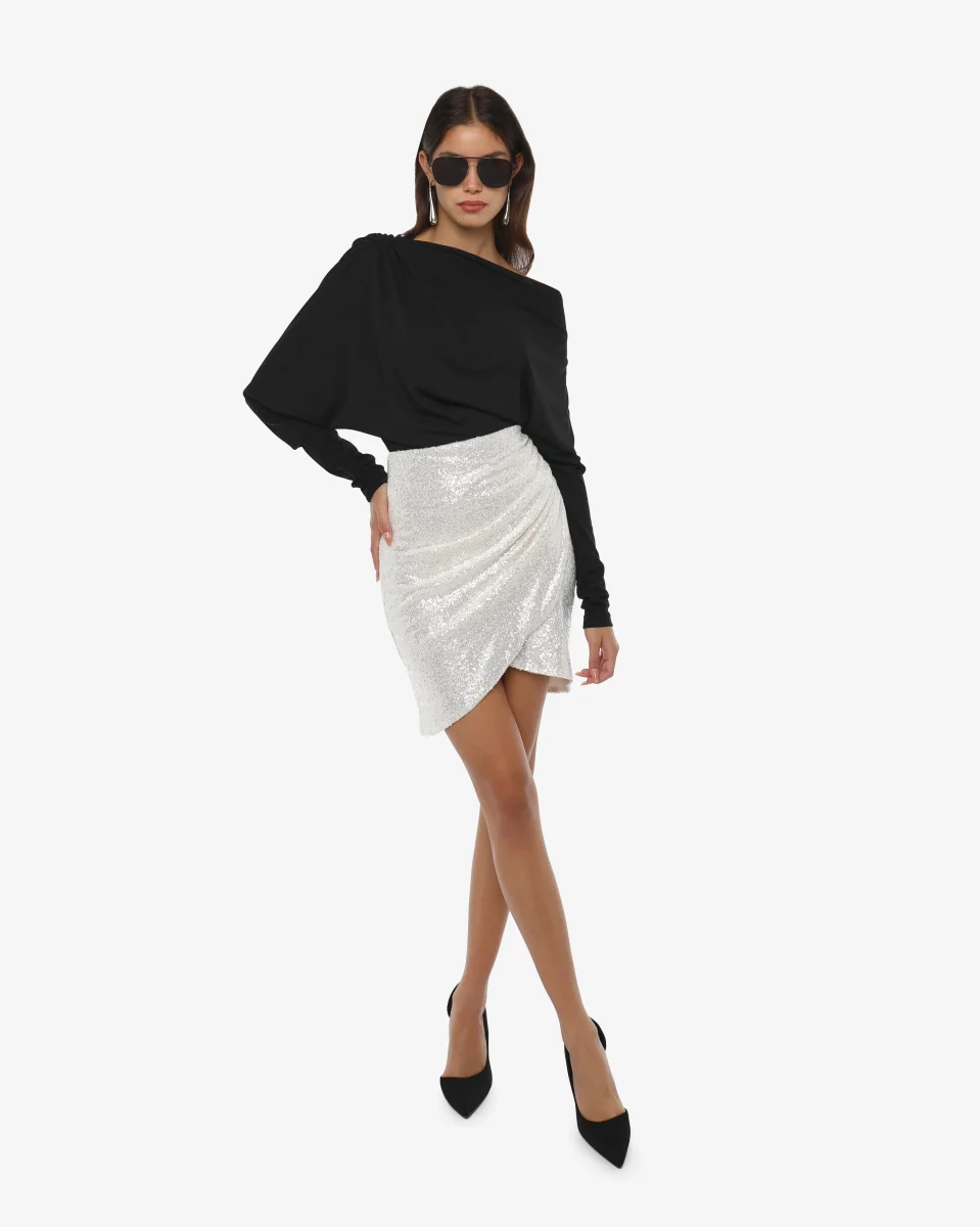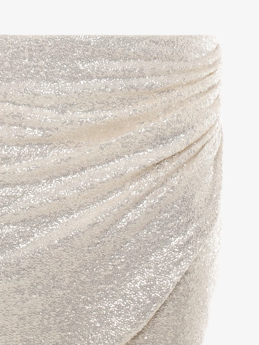 Gonna mini drappeggiata in paillettes, un capo audace e scintillante pensato per serate glamour e occasioni speciali. Realizzata con paillettes luccicanti che catturano la luce a ogni movimento, presenta un design drappeggiato che aggiunge texture e dinamicitร alla silhouette. La vita alta e la lunghezza mini esaltano le forme, creando un effetto femminile e accattivante. Perfetta da abbinare a top aderenti, bluse eleganti o body essenziali, completando il look con tacchi vertiginosi e accessori minimal per un outfit da vera star.