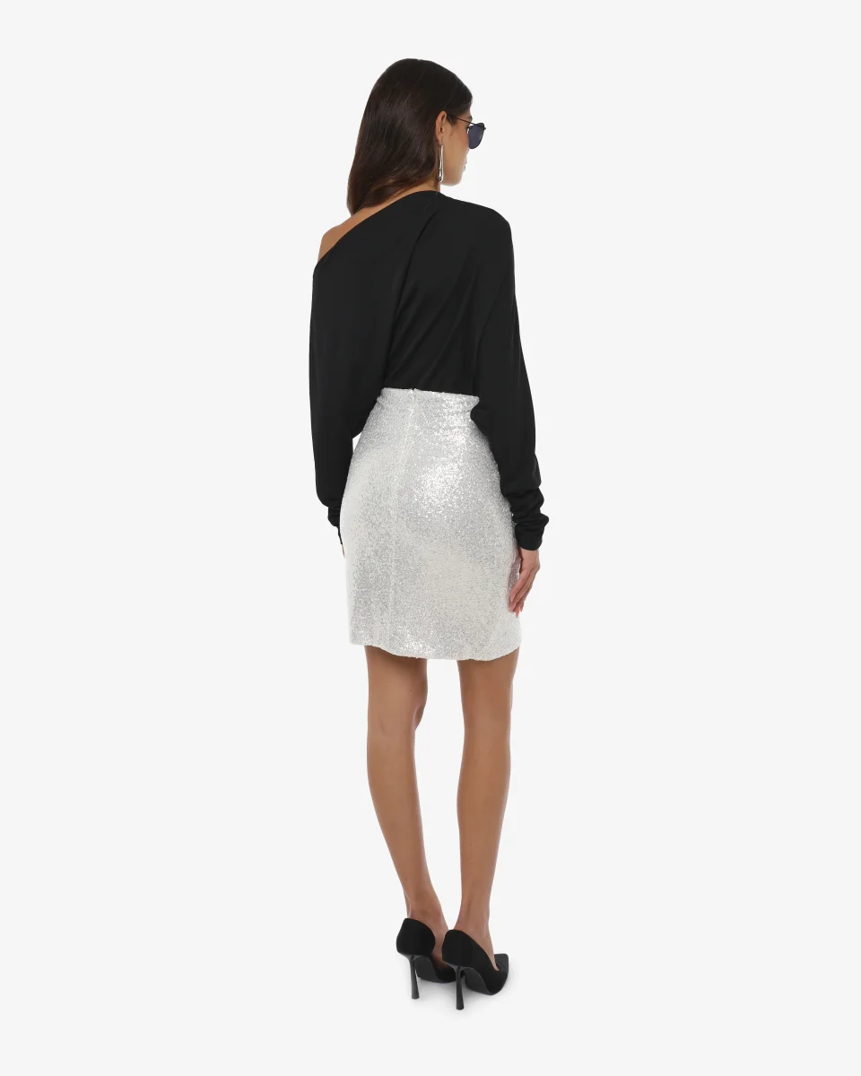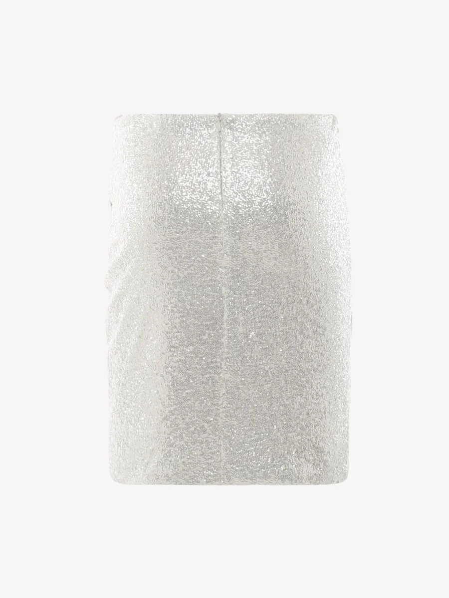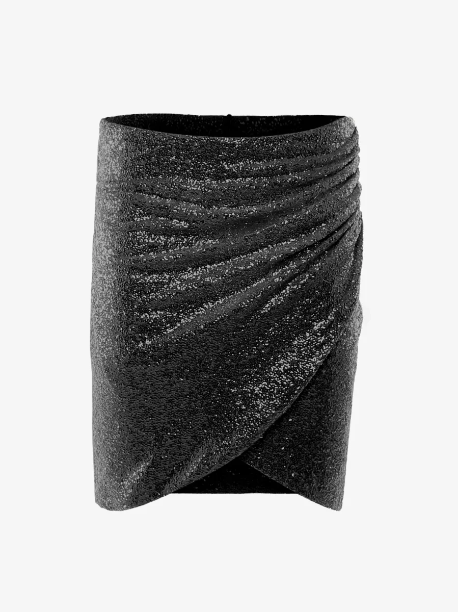 Gonna mini drappeggiata in paillettes, un capo audace e scintillante pensato per serate glamour e occasioni speciali. Realizzata con paillettes luccicanti che catturano la luce a ogni movimento, presenta un design drappeggiato che aggiunge texture e dinamicitร alla silhouette. La vita alta e la lunghezza mini esaltano le forme, creando un effetto femminile e accattivante. Perfetta da abbinare a top aderenti, bluse eleganti o body essenziali, completando il look con tacchi vertiginosi e accessori minimal per un outfit da vera star.