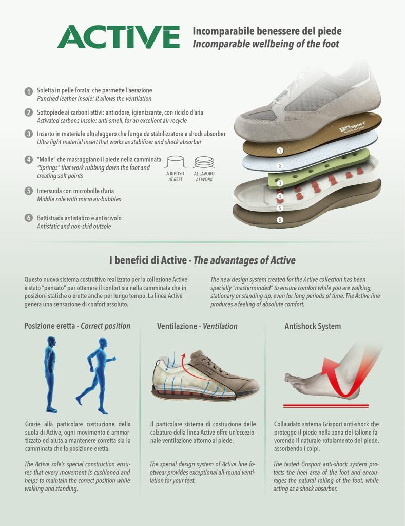 Grazie alla particolare costruzione della suola di Active, ogni movimento รจ ammortizzato ed aiuta a mantenere corretta sia la camminata che la posizione eretta.