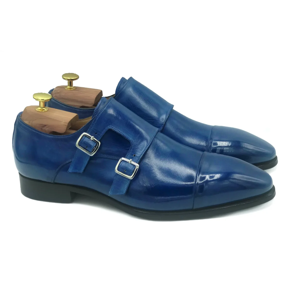 Doppia fibbia in pelle blu, Scarpe sofisticate e senza tempo, colorate interamente a mano per donare una tonalitร unica alle tue calzature
