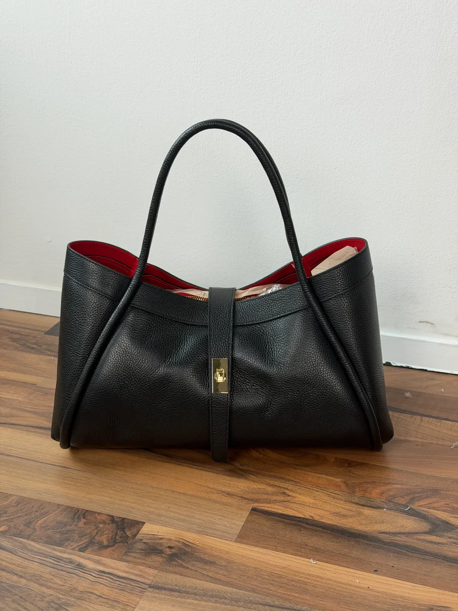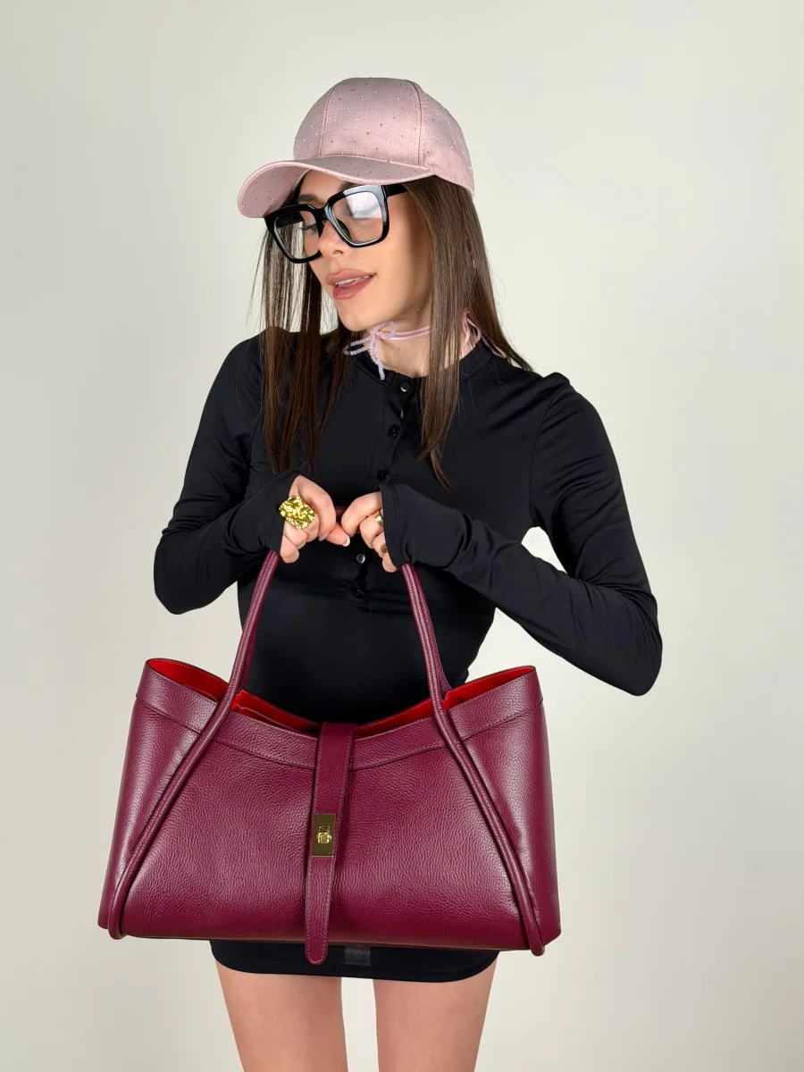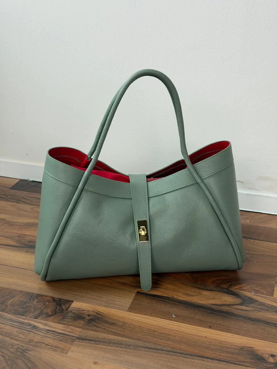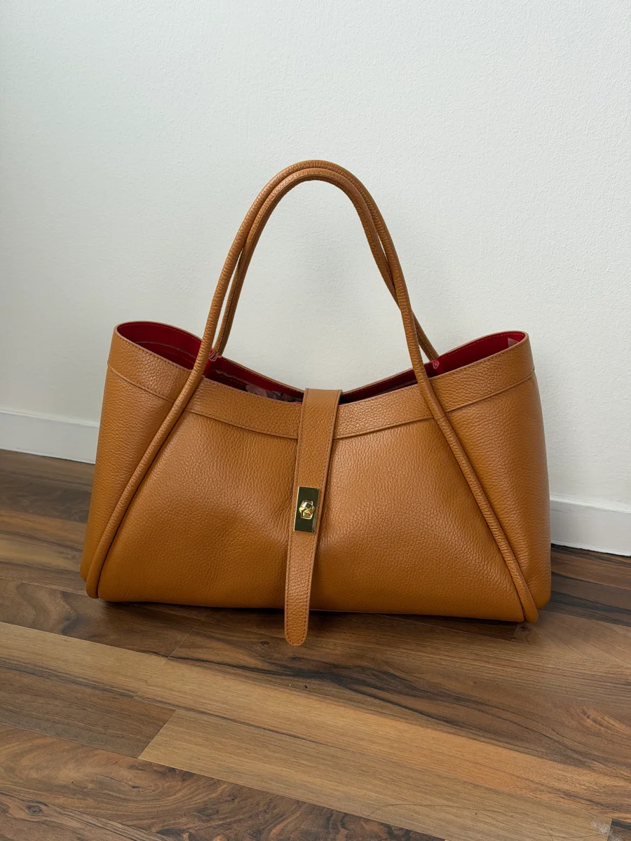 Borsa da donna in vera pelle , made in italy di produzione artigianale.. Chiusura a bottone , 3 scompartimento MISURE: larghezza 40 cm , altezza 23 cm, profonditร 20 cm. Dotata di sacca dustbag antipolvere.