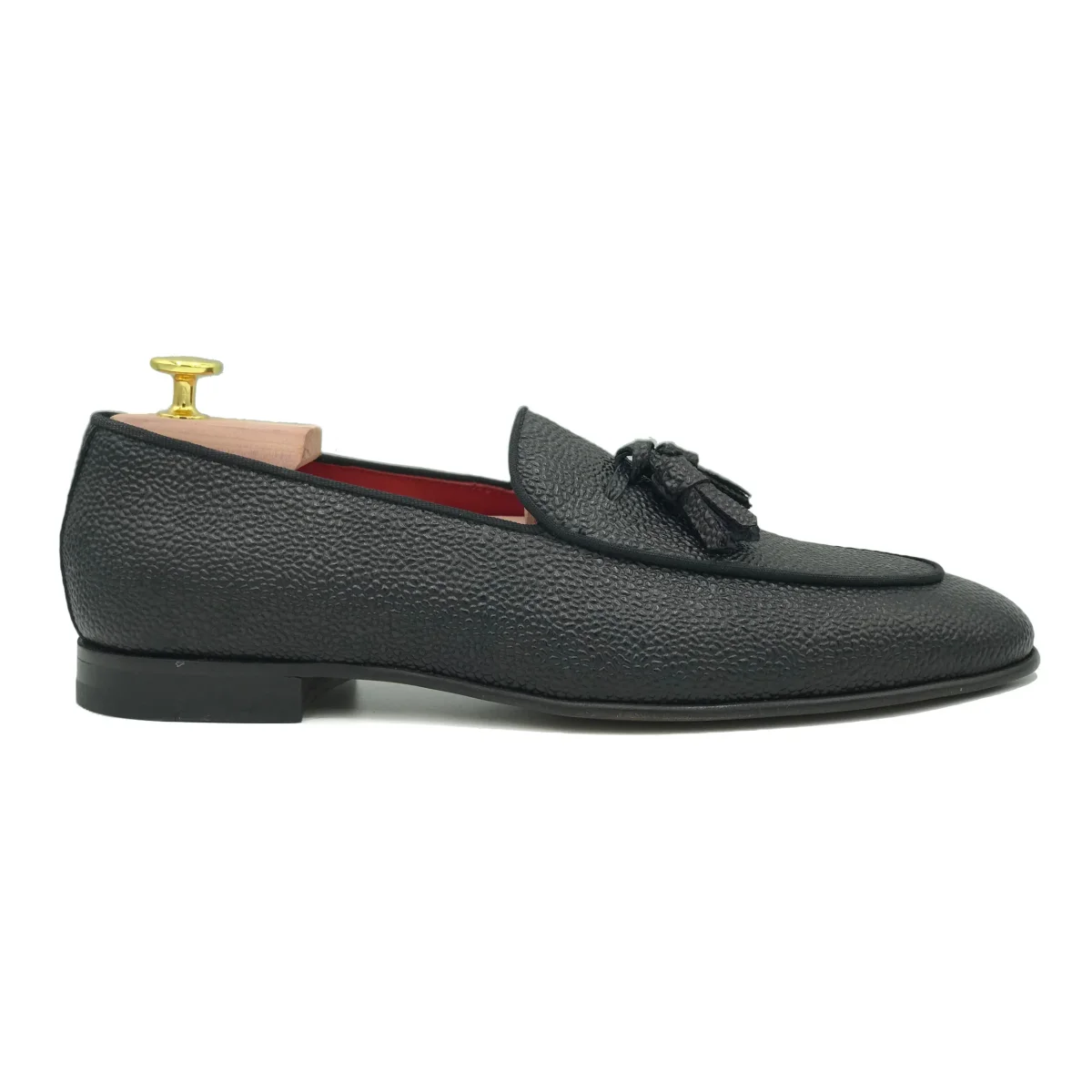 Mocassini con nappine in pelle nera – stampa chicco di riso.