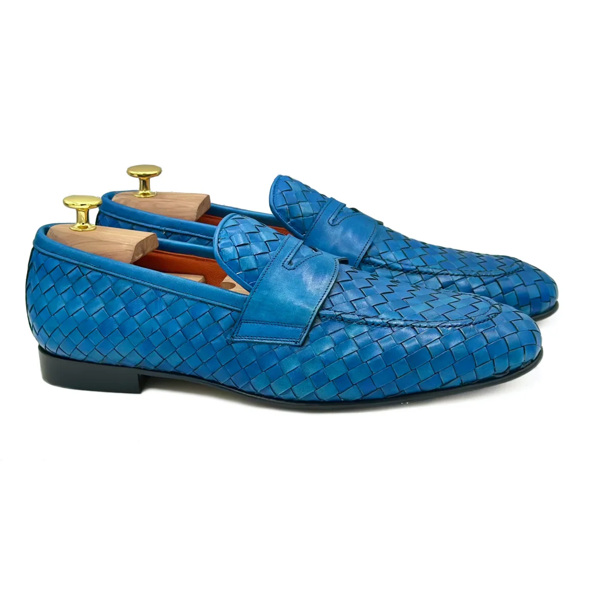 Mocassini in pelle intrecciata blu. Elegante versione dei classici mocassini in pelle intrecciata interamente a mano. Scarpe eleganti ideali per completare il tuo look con classe nelle serate estive. Suola in cuoio.