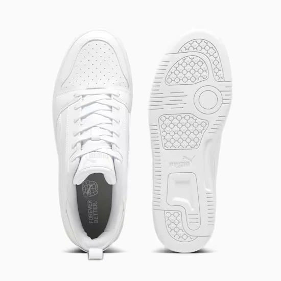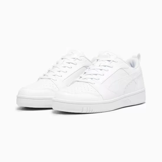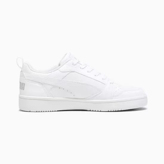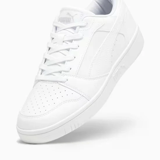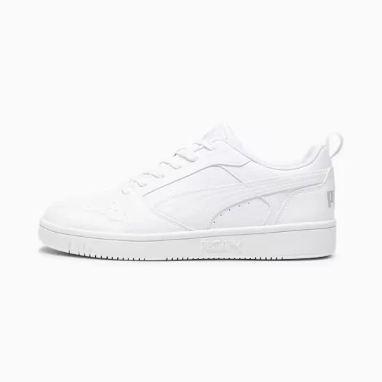 Ispirata al basket, la Rebound Low รจ tornata per cambiare le regole del gioco. La scarpa V6 offre una linea bassa per l’uso quotidiano dentro e fuori dal campo, una tomaia in morbida pelle bottalata e il marchio PUMA con contrasto cromatico per un effetto a impatto. Stile: 392328_03 Colore: PUMA White-Cool Light Gray
