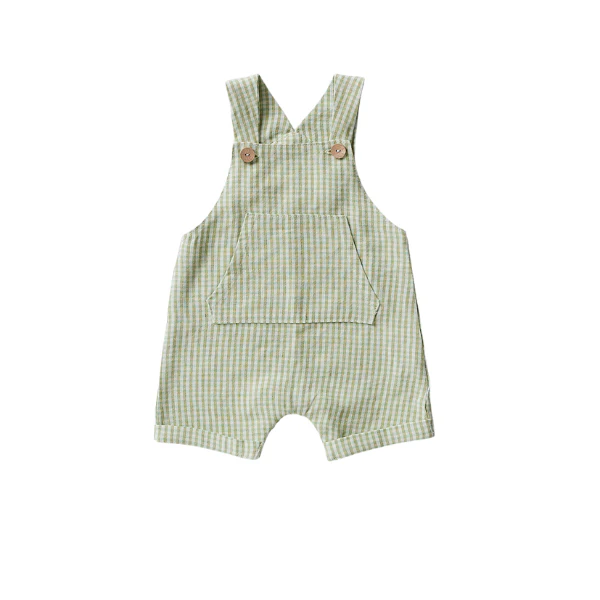 Salopette Aventiquattrore corta in tela con fantasia quadretti bianchi e verdi tasche sul davanti e bretelle con chiusura bottoncino