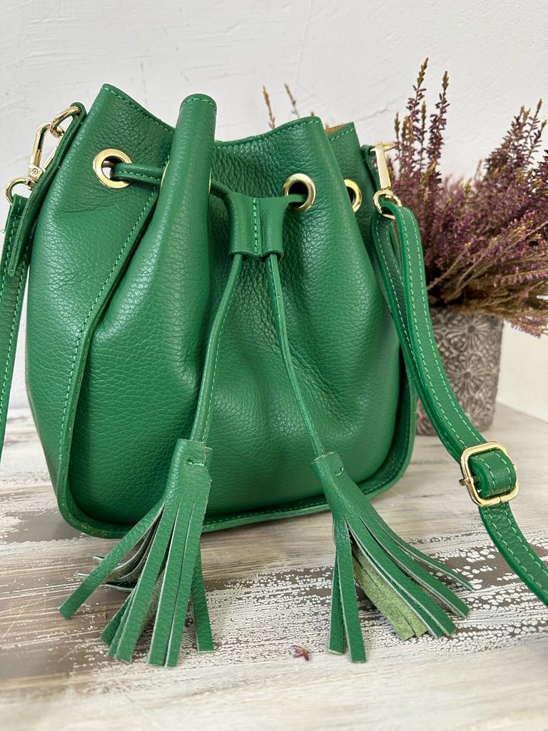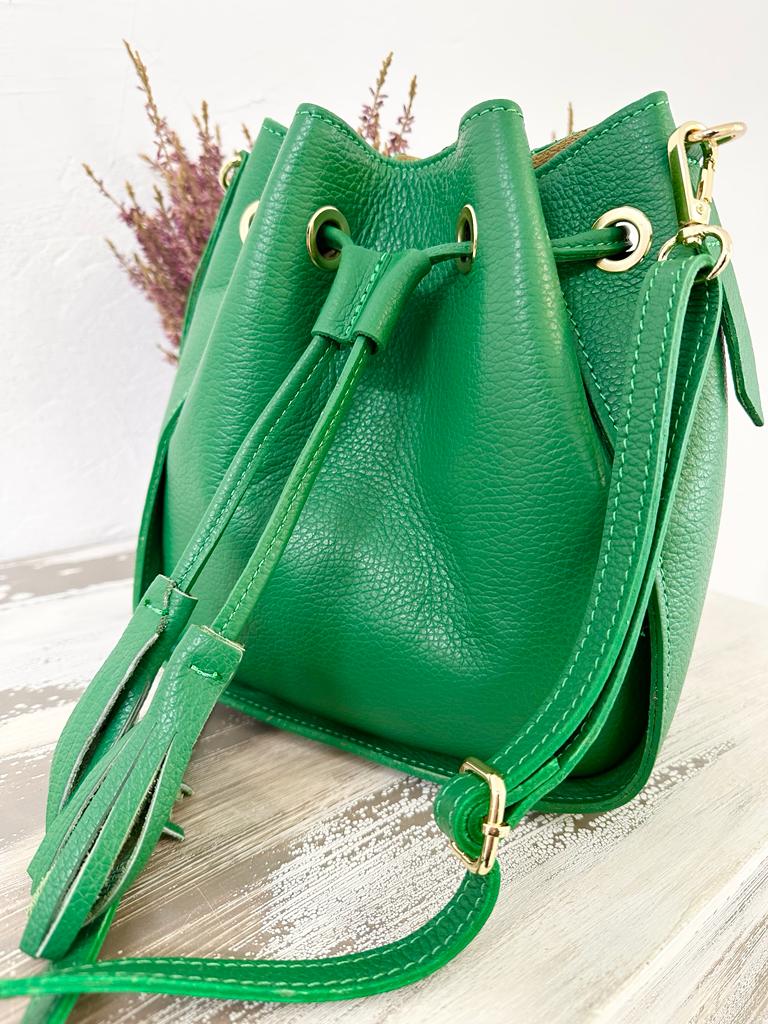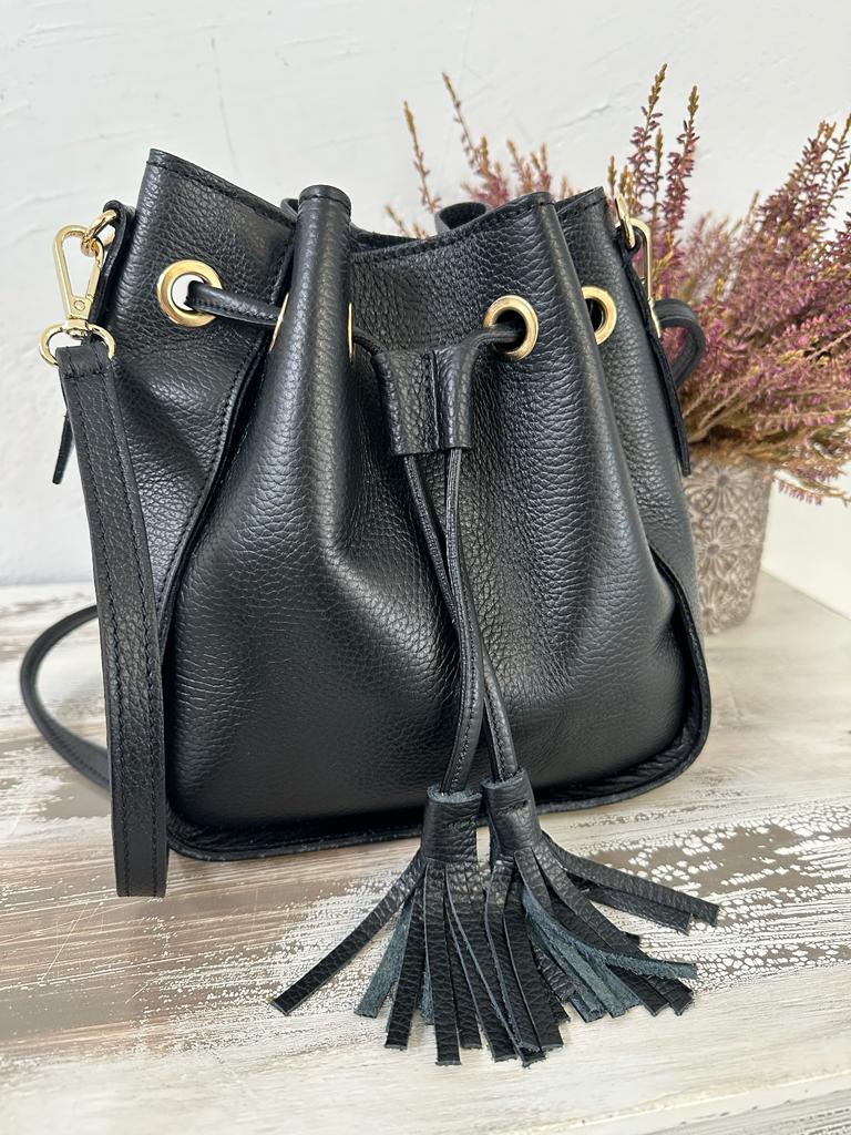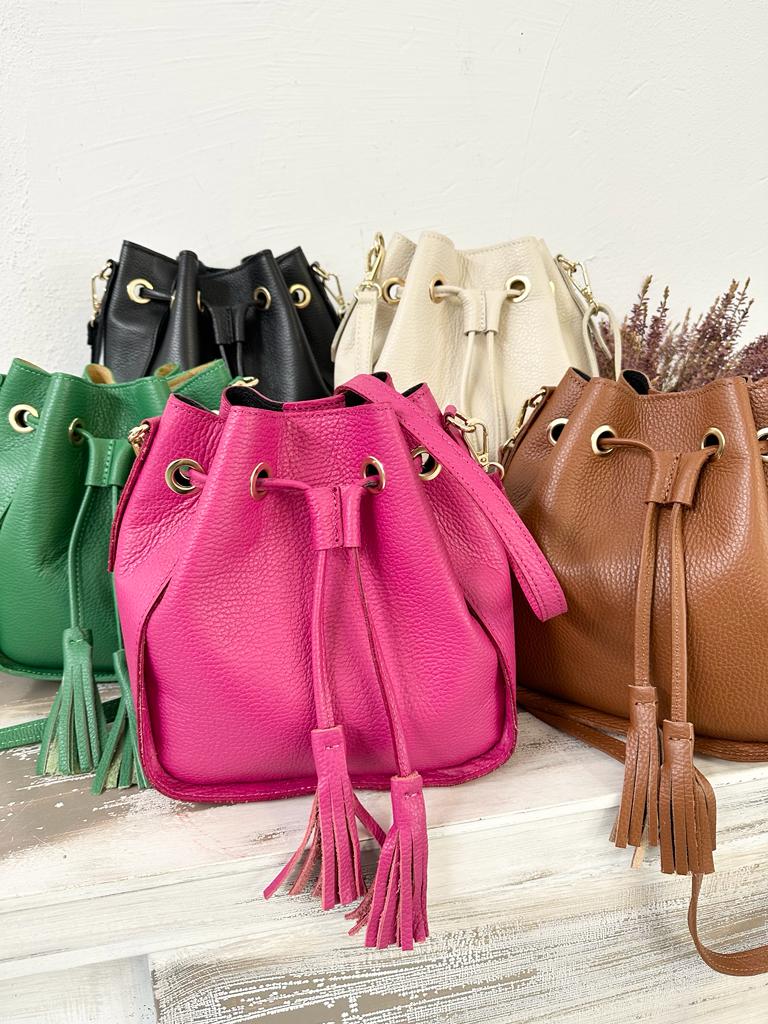 borsa SECCHIELLO vera pelle vitello martellato, made in italy . Dotata di tracolla in pelle regolabile . Taschina INTERNA porta accessori e tasca grande unico scomparto. Chiusura con laccetto e bottone a clip. Tutti gli accessori metallici sono dorati. MISURE: base 22 cm , altezza 24 cm, profonditร 11 Cm. Dotata di sacca dustbag antipolvere.
