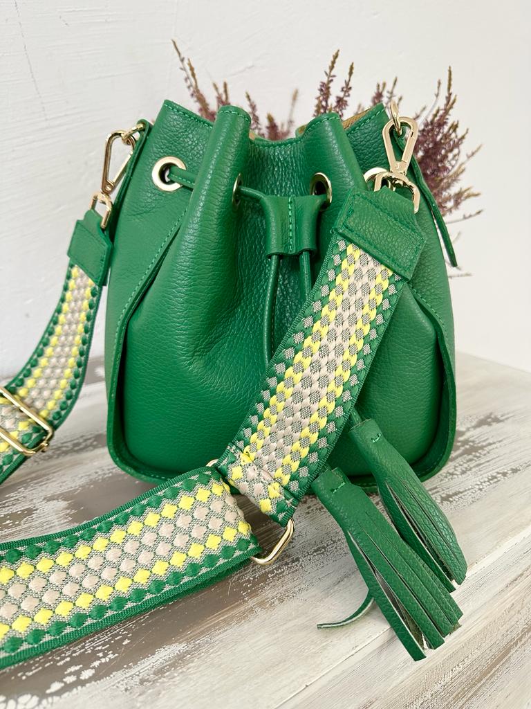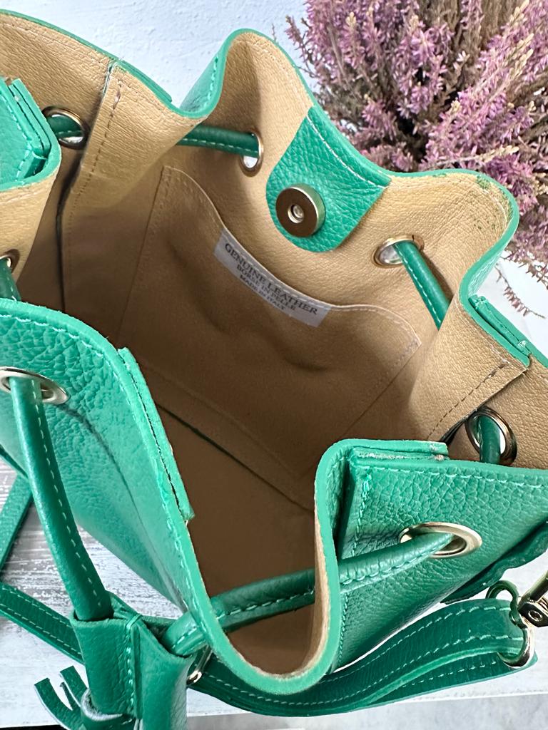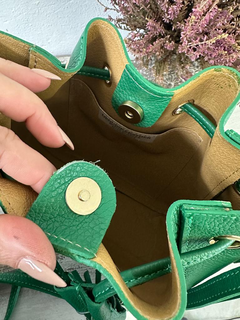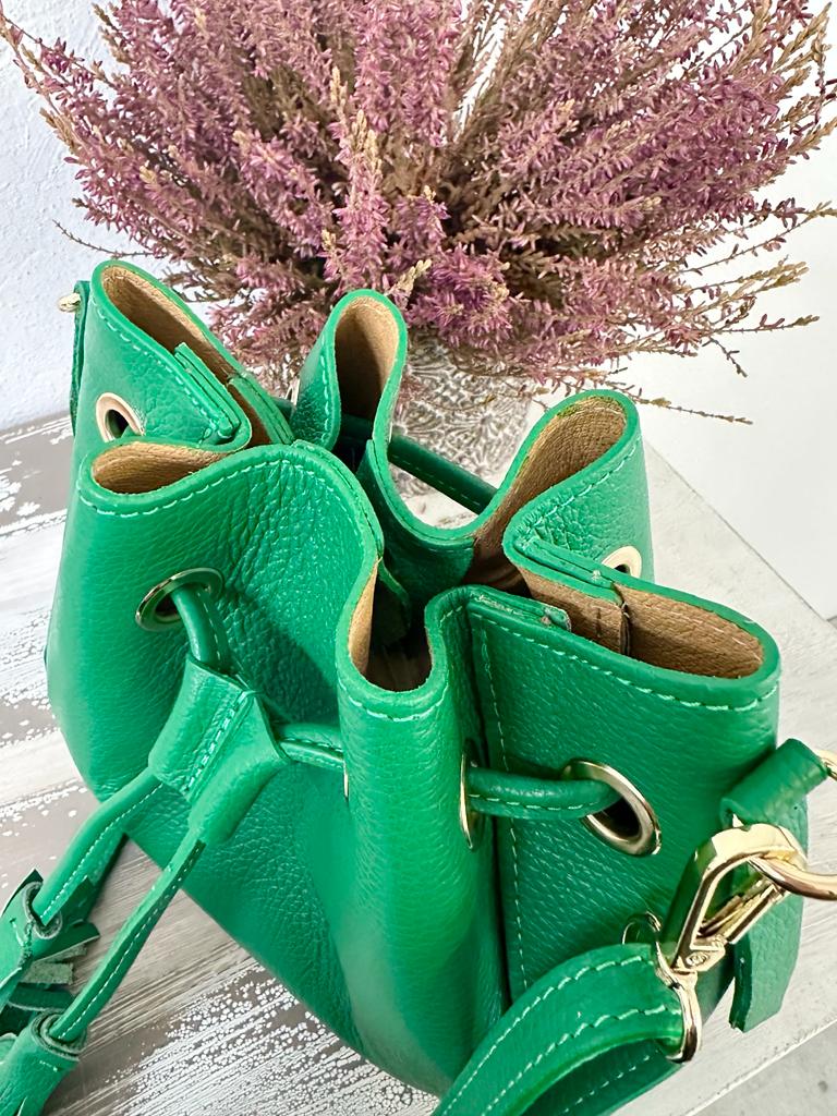 borsa SECCHIELLO vera pelle vitello martellato, made in italy . Dotata di tracolla in pelle regolabile . Taschina INTERNA porta accessori e tasca grande unico scomparto. Chiusura con laccetto e bottone a clip. Tutti gli accessori metallici sono dorati. MISURE: base 22 cm , altezza 24 cm, profonditร 11 Cm. Dotata di sacca dustbag antipolvere.