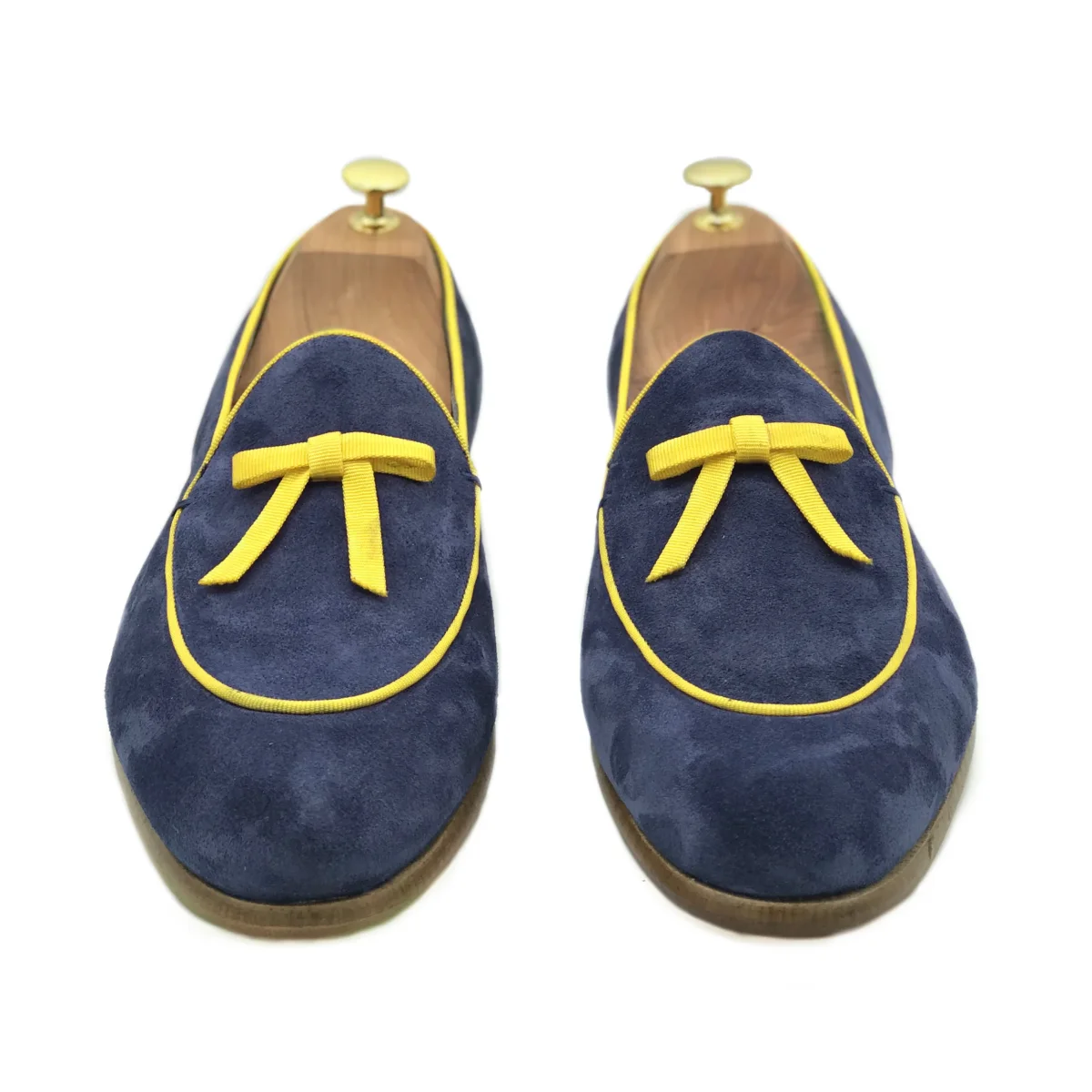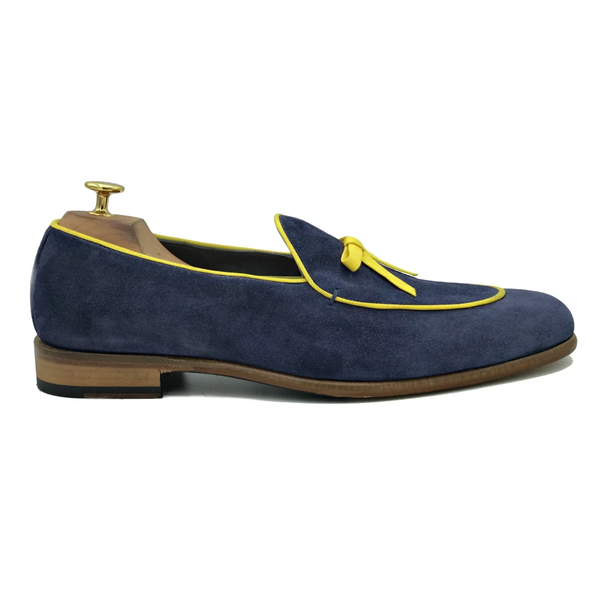 Belgian loafers in pelle scamosciata blu e con suola in cuoio, rifiniti con dettagli dai colori accesi. Scarpe comode e versatili perfette per distinguersi nelle serate primaverili ed estive Materiale: Pelle scamosciata Colore: Blu e giallo Suola: Cuoio Costruzione : Blake Se vuoi cambiare colore, materiale o tipo di suola, compila il form sottostante: realizzeremo […]