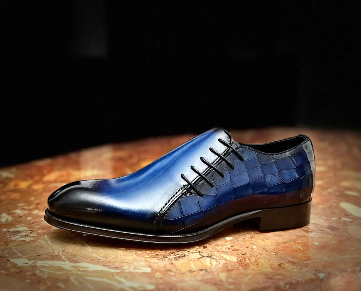 Stringate in pelle blu. Scarpe con allacciatura laterale finemente sfumate e colorate a mano. Calzature rese uniche dalla sezione laterale in stampa cocco che dona al tuo stile un elemento unico.