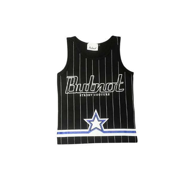 Tshirt a canotta ButNot nera con righe bianche e scritta “ButNot” bianca sul davanti e righe con stella sul fondo