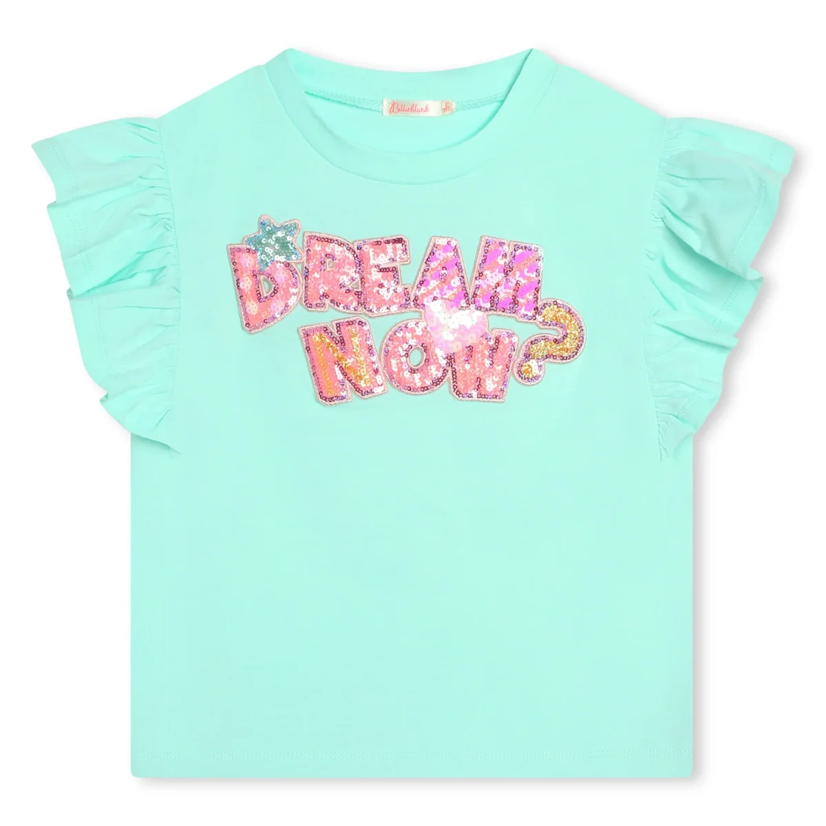 Tshirt Billieblush di colore verde acqua girocollo con giromanica con rouches con scritta “Dream now” sul davanti con paillettes di colore rosa Composizione: 100% cotone