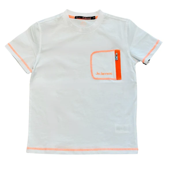 Tshirt Jeckerson di colore bianco con taschino con zip sul davanti con dettagli di color arancio fluo