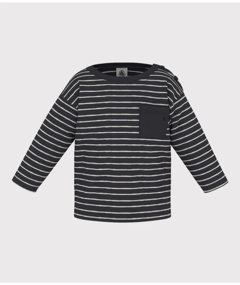 Tshirt manica lunga Petit Bateau a righe blu e bianche e taschino sul davanti .