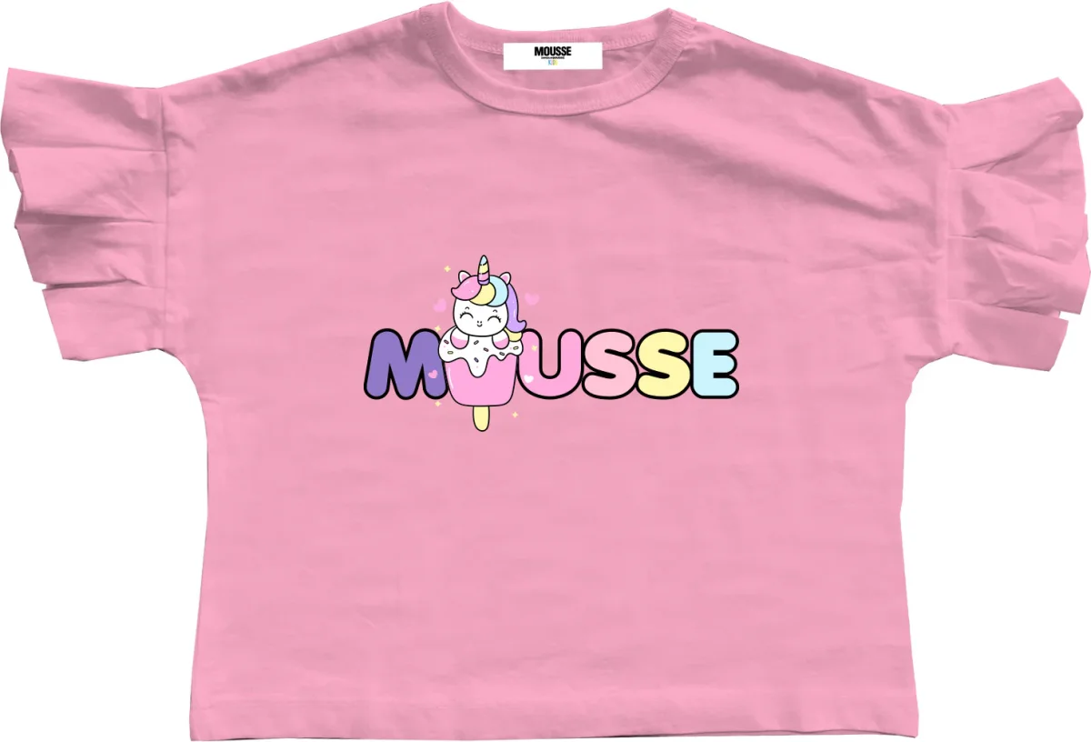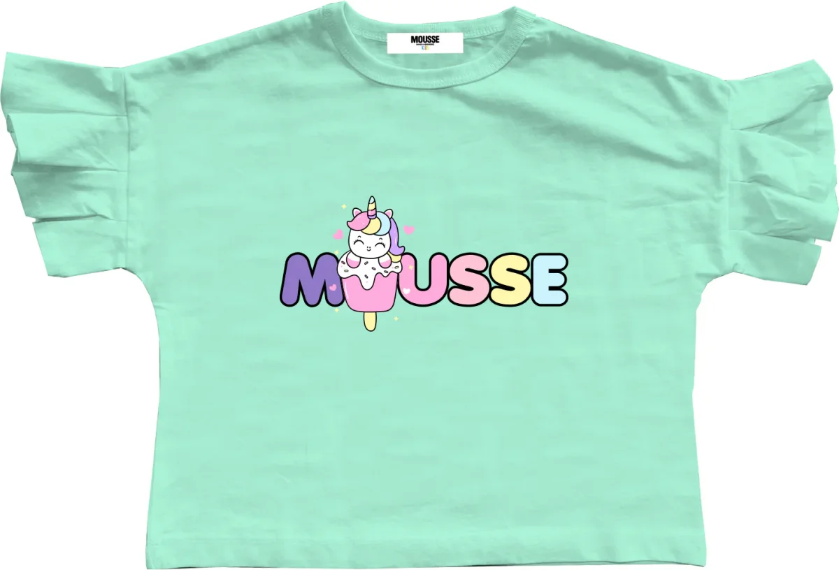 Tshirt Mousse crop con rouches sulla manica e scritta “Mousse” sul davanti con unicorno e gelato