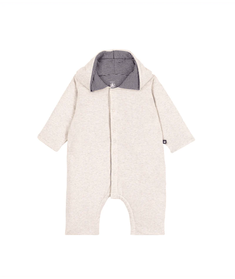 Tuta intera in felpa Petit Bateau grigia con bottoni sul davanti e cappuccio.
