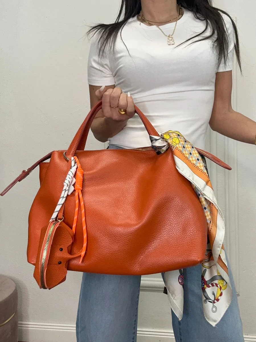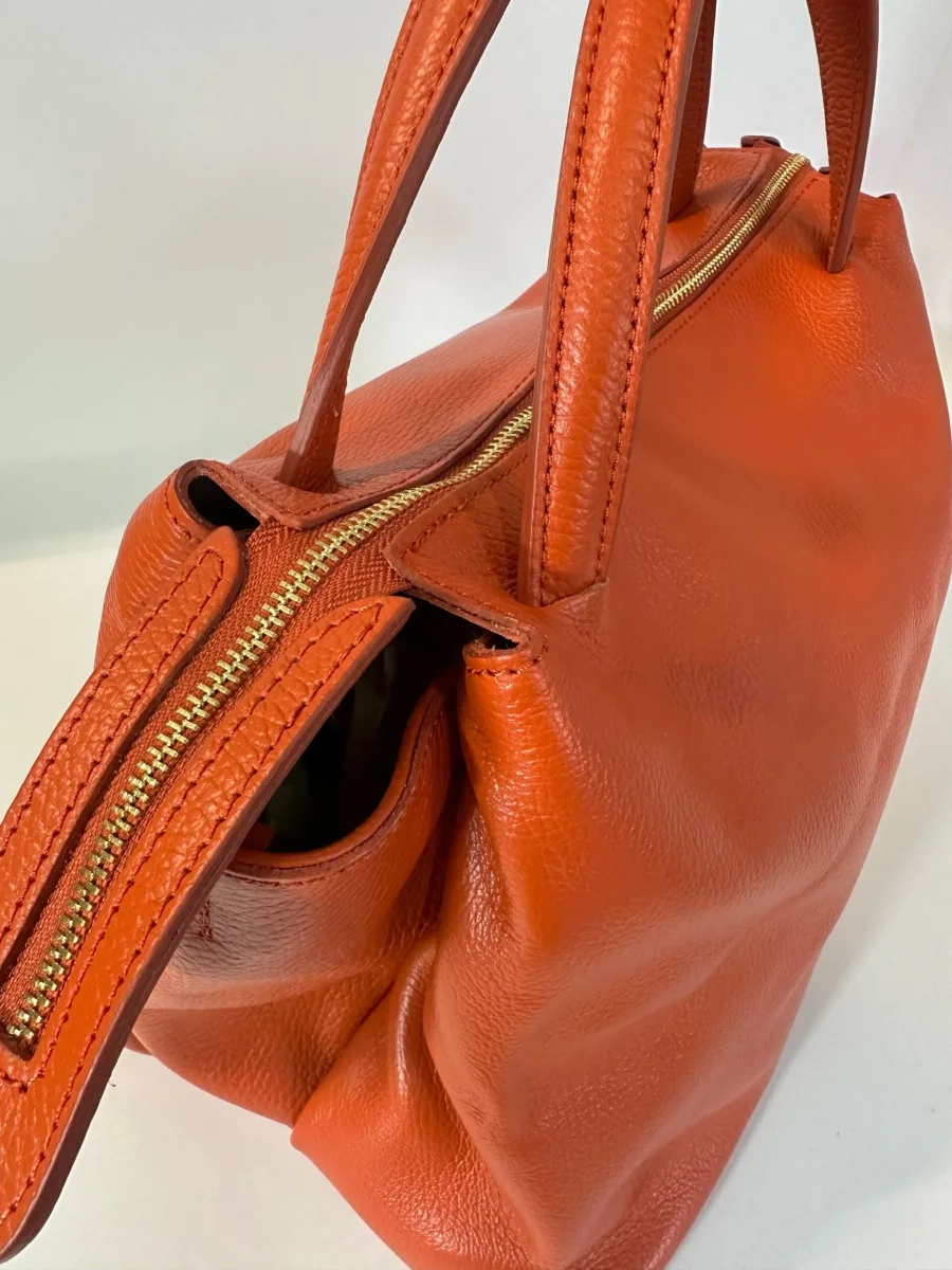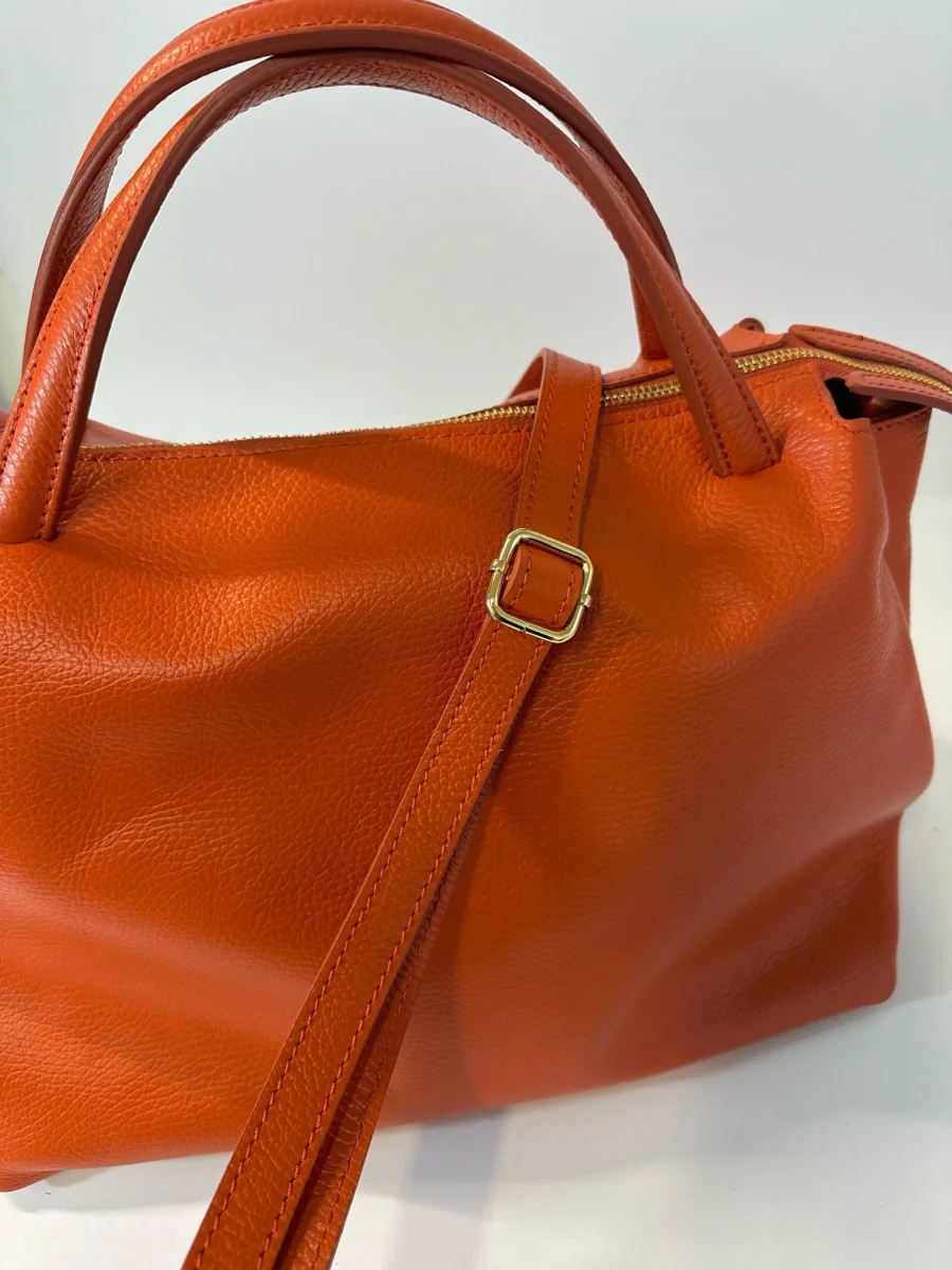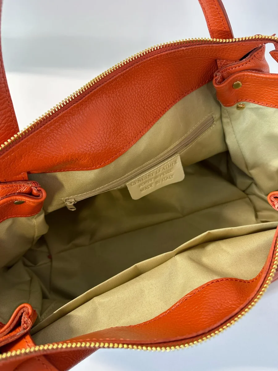 borsa da donna in vera pelle , cuoio martellato made in italy di produzione artigianale. Dotata di doppi manici e tracolla in pelle regolabile .Chiusura con zip , dotata di tasche interne porta accessori. MISURE: base 38 cm , altezza 39 cm ,. Dotata di sacca dustbag antipolvere.