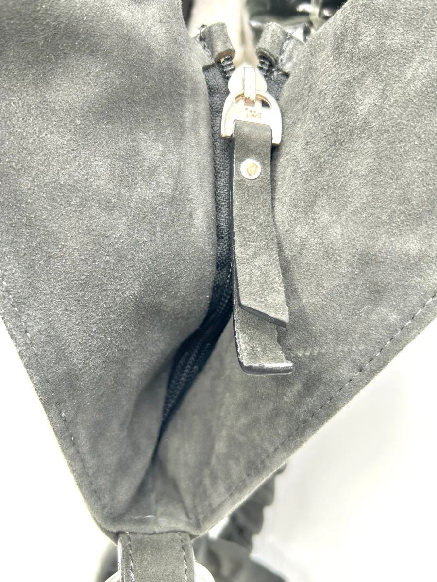 Dettagli: preziose borchie sulla borsa frontale, targhetta logo, chiusura zip e chiusura bottone calamita, tasca interna e tasca interna con chiusura zip, tracolla in vera pelle scamosciata con ganci