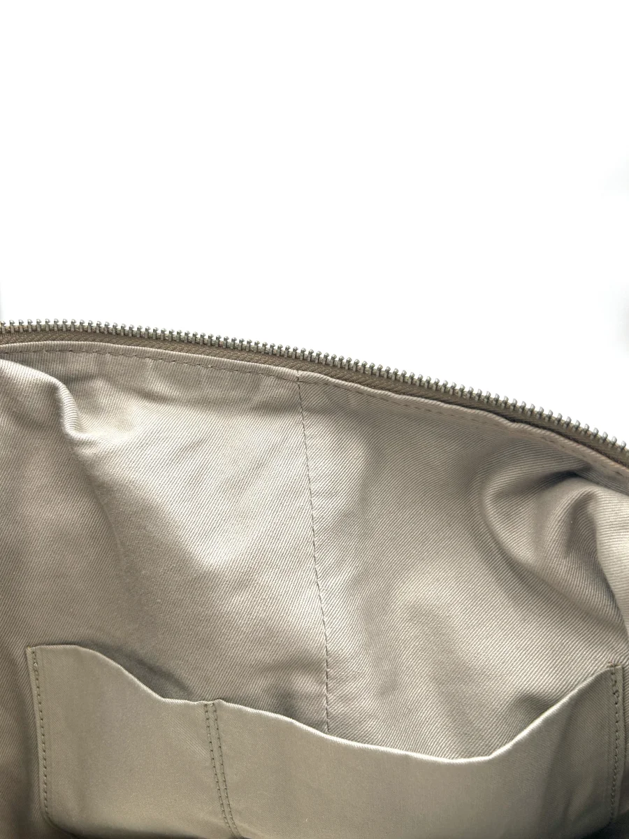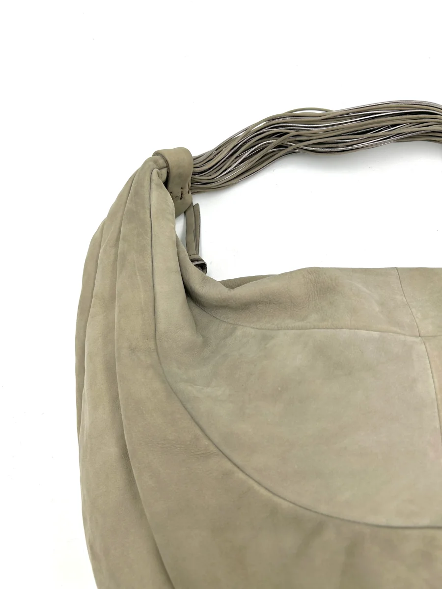 Dettagli: base della borsa con piedini di appoggio, apertura regolabile con lacci scorrevoli, 2 nappine in pelle, manici in pelle, tracolla in pelle scamosciata con ganci, parte superiore della borsa in camoscio, tasca interna e tasca interna con chiusura zip