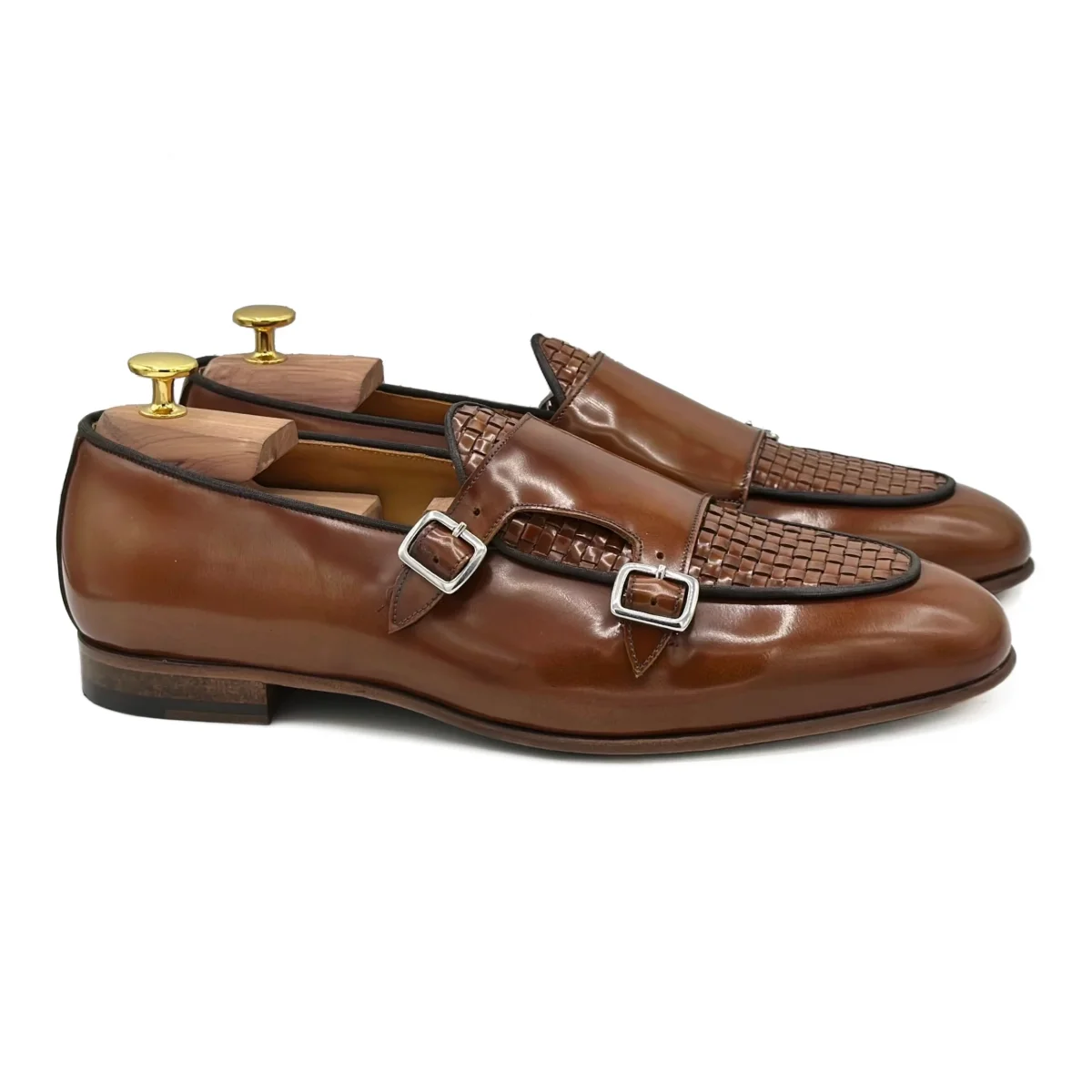 Mocassini con doppia fibbia in pelle marrone spazzolata. Eleganti mocassini in pelle di vitello marrone con pattina centrale in pelle intrecciata. Linea raffinata ed esclusiva per queste scarpe, ideali per le tue occasioni piรน eleganti o per una passeggiata in cittร .